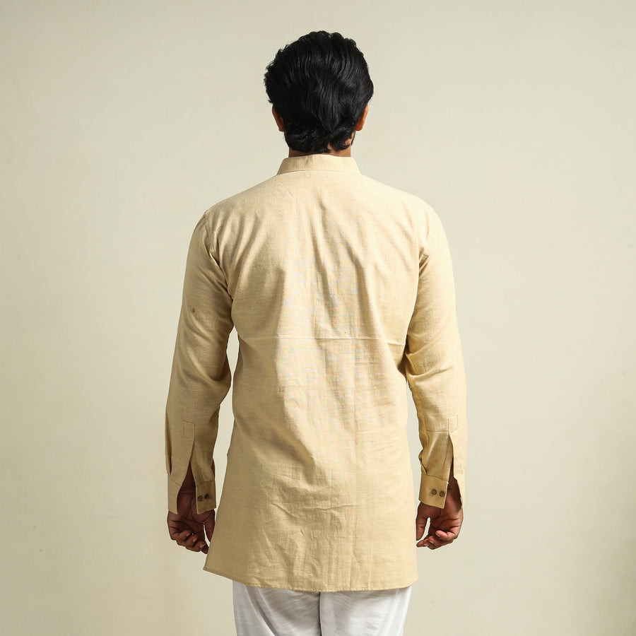 This plain handloom men's short kurta offers comfort and ease throughout the day. With full sleeves, a front button placket, and a convenient patch pocket, it seamlessly blends style and ease. Perfect for daily wear or special occasions, this casual kurta exudes versatility. Elevate your fashion effortlessly with this ideal choice for outings, showcasing a perfect fusion of comfort and style.