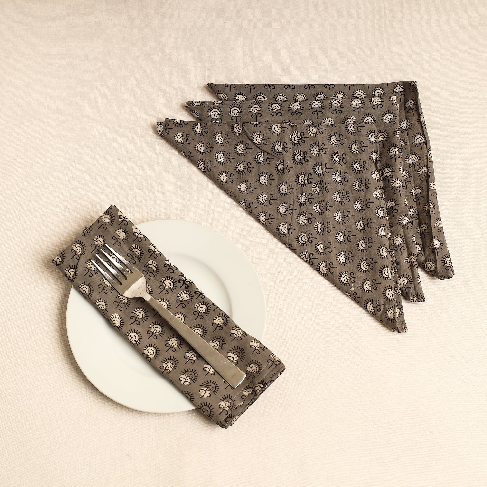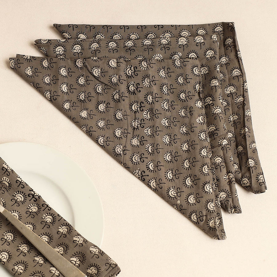 Fine quality grey bagru block printed cotton table napkins, made using natural dyes through traditional mud resist process by using hand carved wooden block practiced in Bagru, Rajasthan. Artisanally crafted with intricate traditional patterns, these napkins add a touch of timeless elegance to any table setting. Perfect for both casual and formal occasions, they effortlessly combine style and functionality, making every meal a delightful affair.