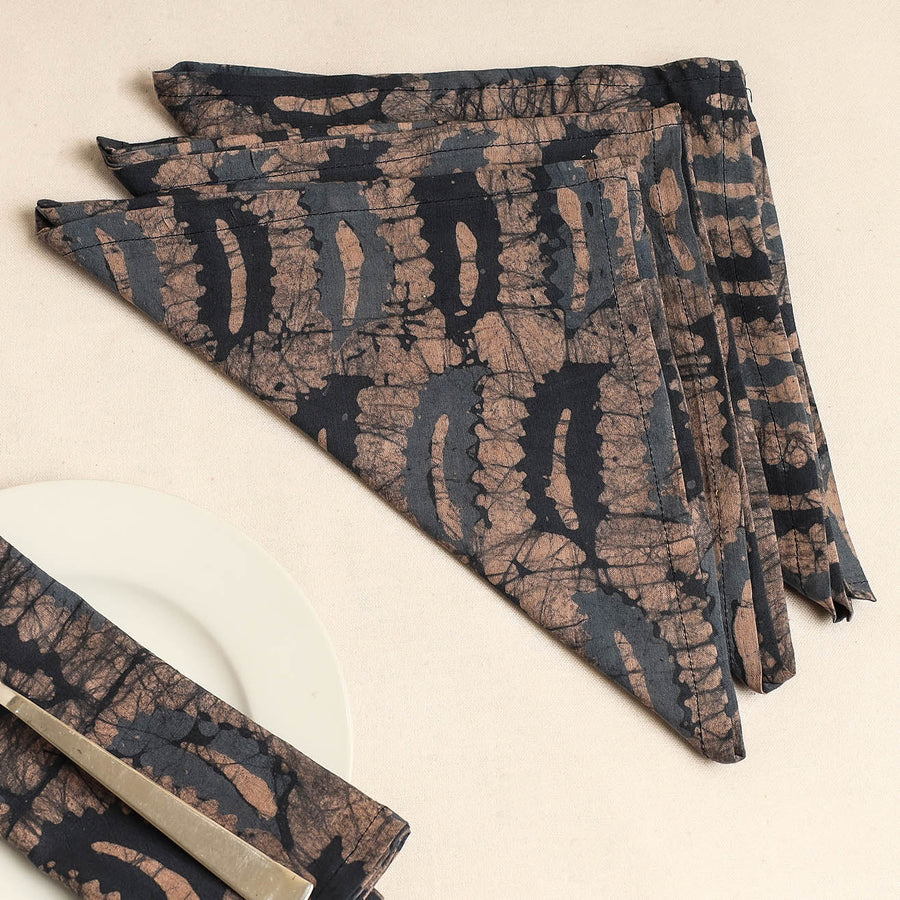 Elevate your dining experience with our brown hand-batik-printed cotton table napkins. Each napkin is a testament to artisanal precision, featuring unique patterns and vibrant colors. these napkins add a touch of traditional charm to any table setting. Perfect for both casual and formal occasions, they effortlessly combine style and functionality, making every meal a delightful affair.