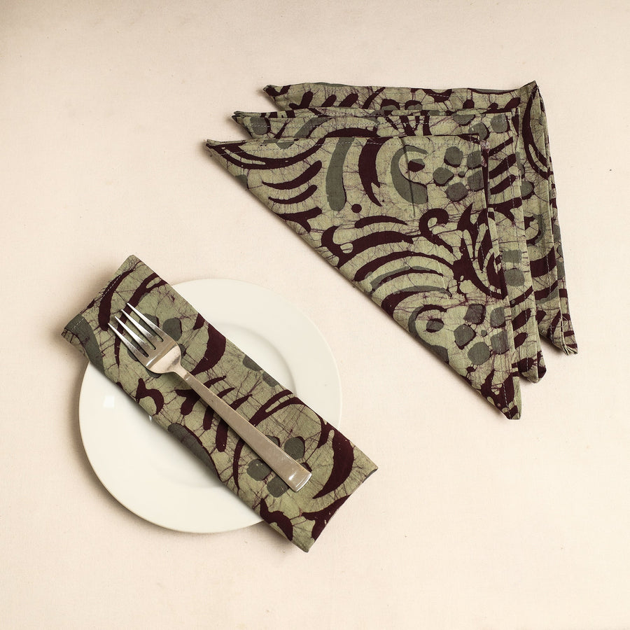 Elevate your dining experience with our green hand-batik-printed cotton table napkins. Each napkin is a testament to artisanal precision, featuring unique patterns and vibrant colors. these napkins add a touch of traditional charm to any table setting. Perfect for both casual and formal occasions, they effortlessly combine style and functionality, making every meal a delightful affair.