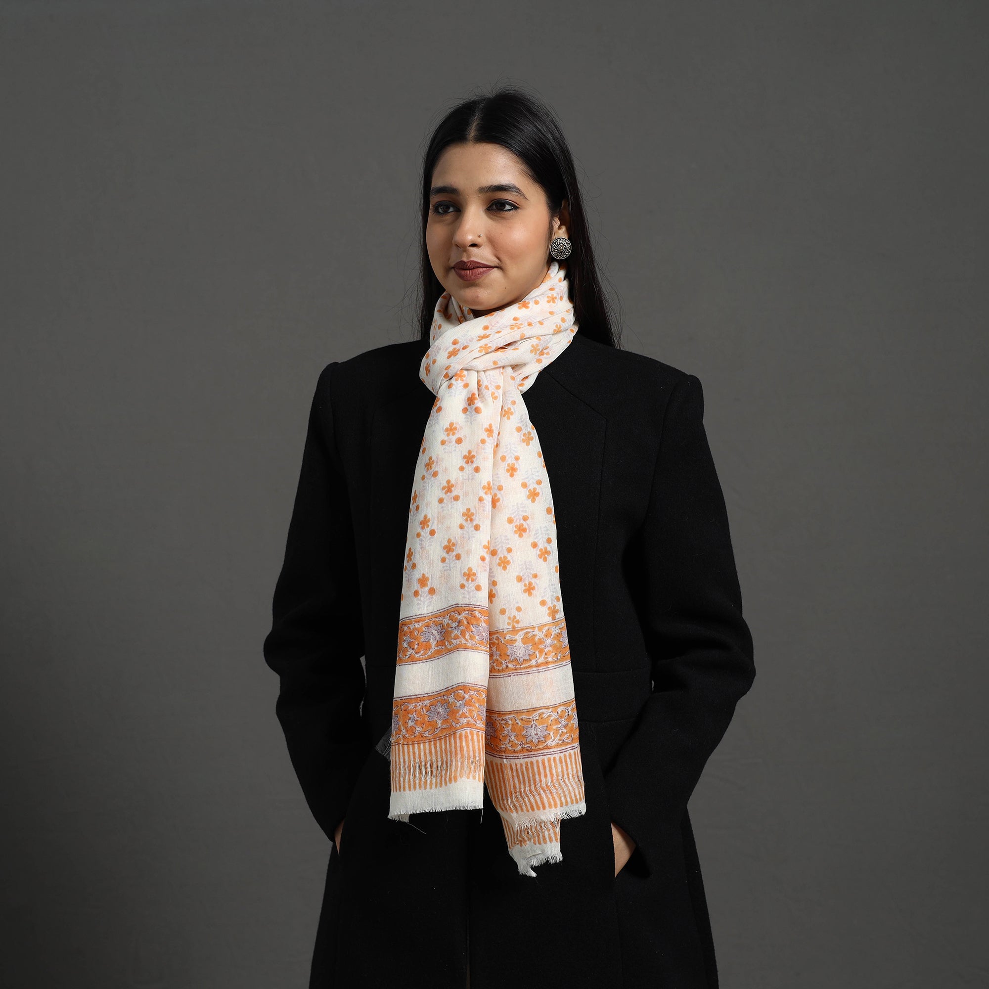 | Material | Experience the rich heritage of Rajasthan with our pure wool orange block print sanganeri stole. The pure wool construction offers exceptional warmth and softness, making it perfect for cold weather. The bleed-free VAT dyes ensure lasting vibrancy. The elaborate detailing of the flowers and petals showcases the artistry of this hand-block printing technique originating from Sanganer, Rajasthan. Embrace timeless elegance and support artisanal craftsmanship with this unique accessory. |