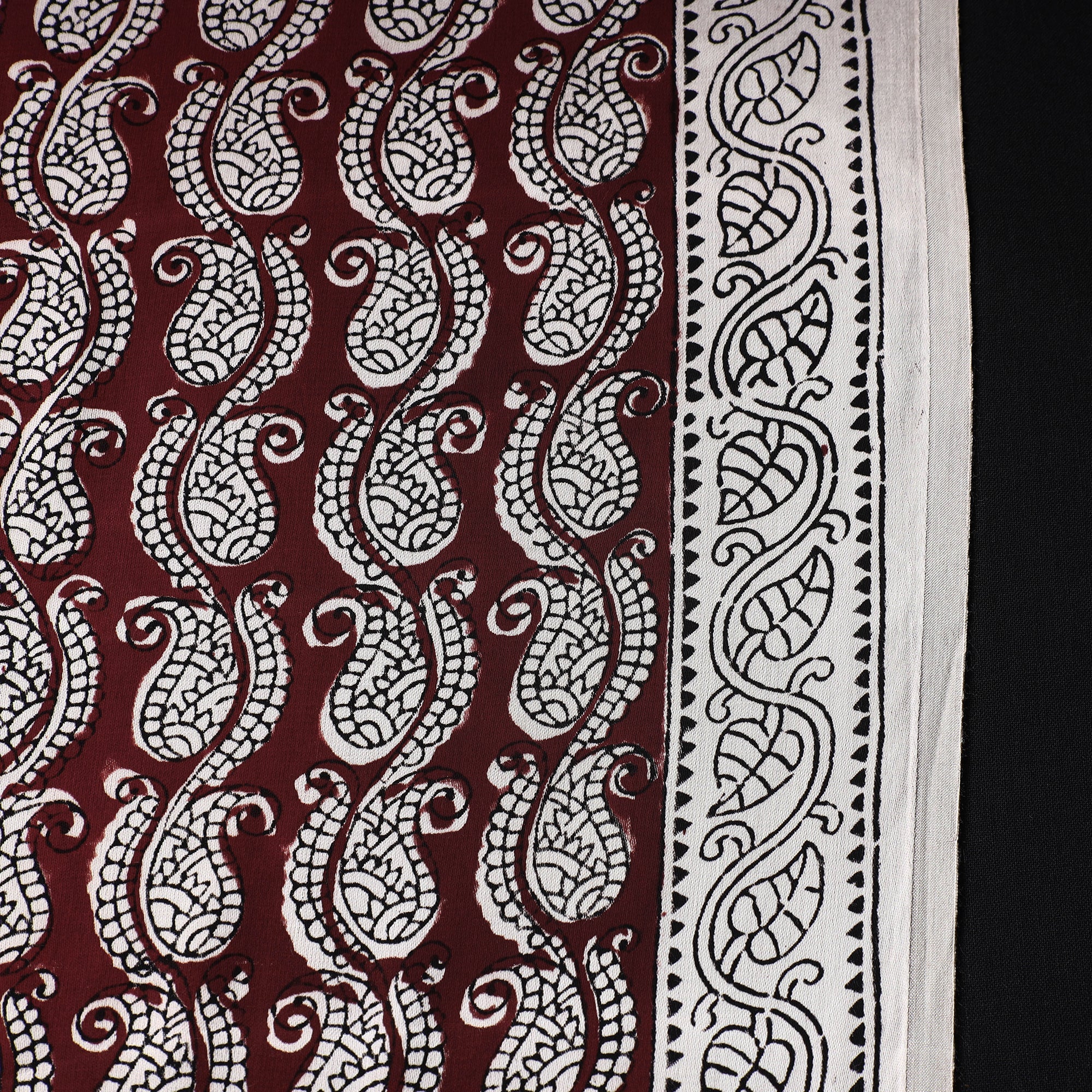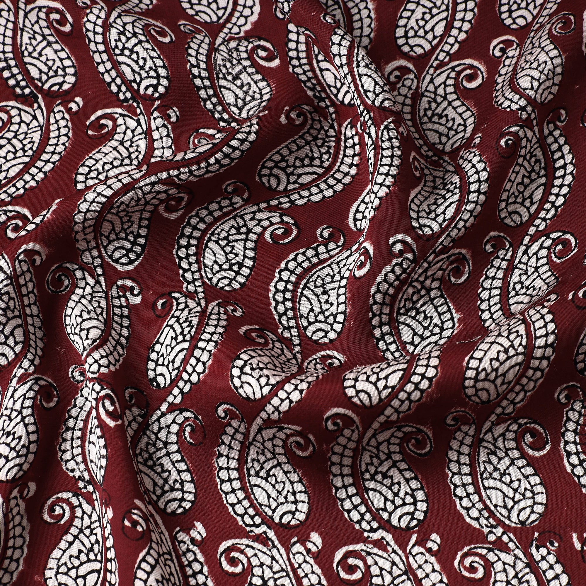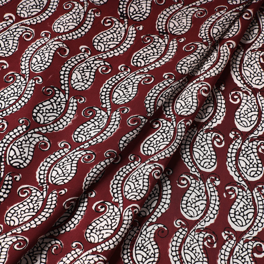 Fine quality maroon bagh hand block printed natural dyed modal satin fabric. Bagh Artisans inspired by the Bagh river, skillfully craft intricate geometric and floral compositions using earthy tones. New blocks for printing are made by hand from teak or rosewood but some blocks have been in use for 200–300 years. Motifs for the prints are geometric or floral sometimes inspired by the 1500-year-old printing in the Bagh Caves.This fabric Meticulously made by master artisan Mohammed Rafik Ji Khatri, who practices the age-old art of Bagh block printing in the Dhar district of Madhya Pradesh, this fabric is a testament to skilled artistry. Using natural dyes and following traditional processes.