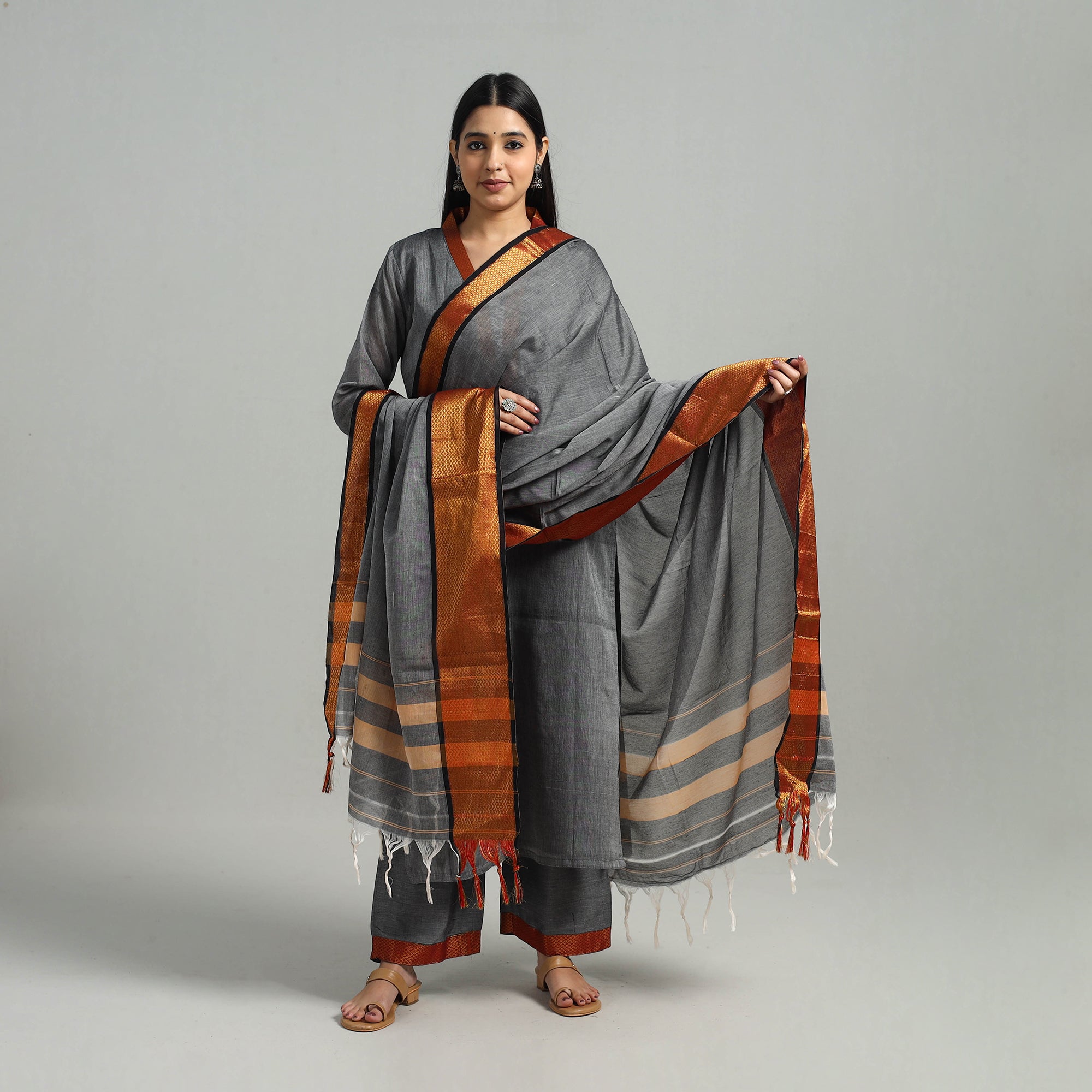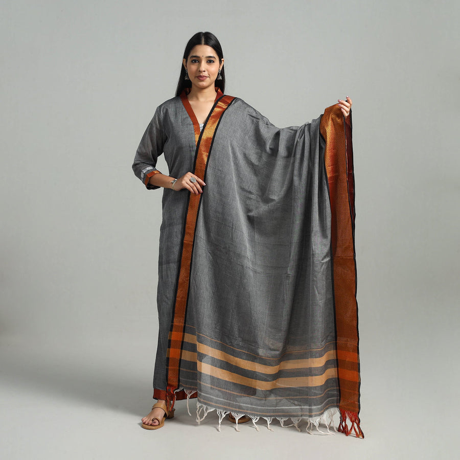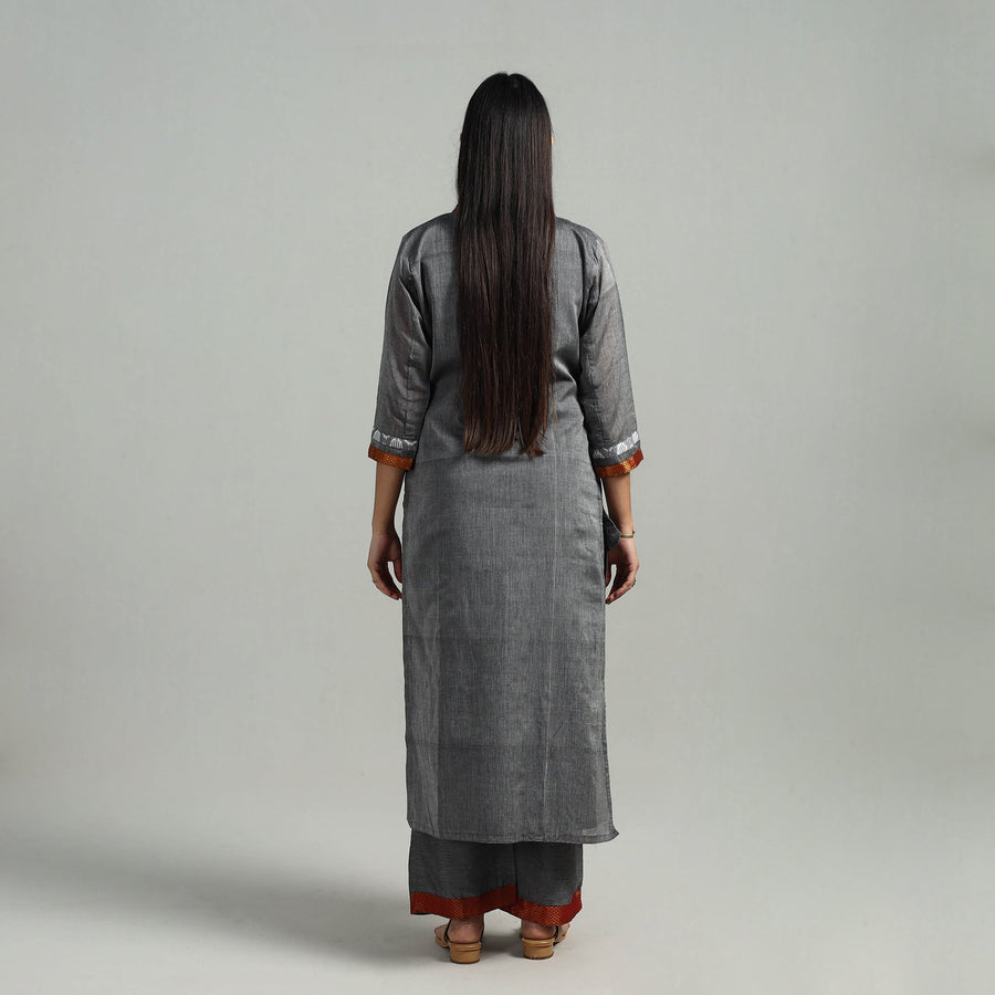 This uniquely designed cotton grey dharwad kurta set with palazzo & dupatta is the perfect blend of comfort and style. This kurta set is crafted from cotton fabric, ensuring a comfortable feel against your skin. The kurta also features a convenient one-side pocket, perfect for carrying small essentials, and the palazzo features an elasticized waist and two side pockets, adding functionality to this palazzo. It boasts an exquisite zari border, adding a touch of elegance to your ensemble. Perfect for special occasions, this suit set combines fashion and functionality effortlessly, ensuring you look and feel beautiful with ease.