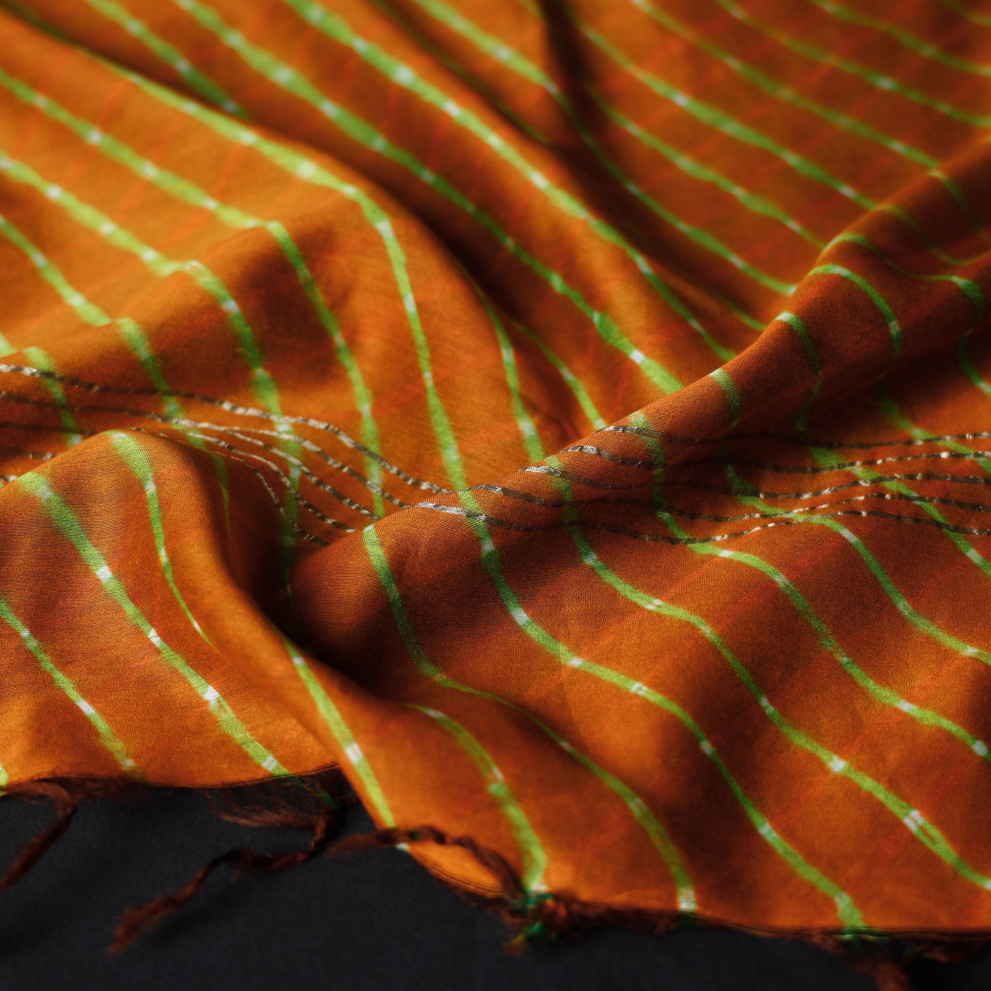 The exquisite craftsmanship of this fine quality orange leheriya tie-dye chanderi silk cotton dupatta. The beautiful wavy patterns on this dupatta are created using the traditional leheriya tie-dye technique by the master artisan family of Badshah Miyan in Rajasthan. Made with azo-free dyes. The blend of chanderi silk and cotton gives it a gossamer look and a luxurious feel. Complete with tassels, this dupatta is a perfect accessory to elevate your outfit and add a touch of elegance to any occasion.