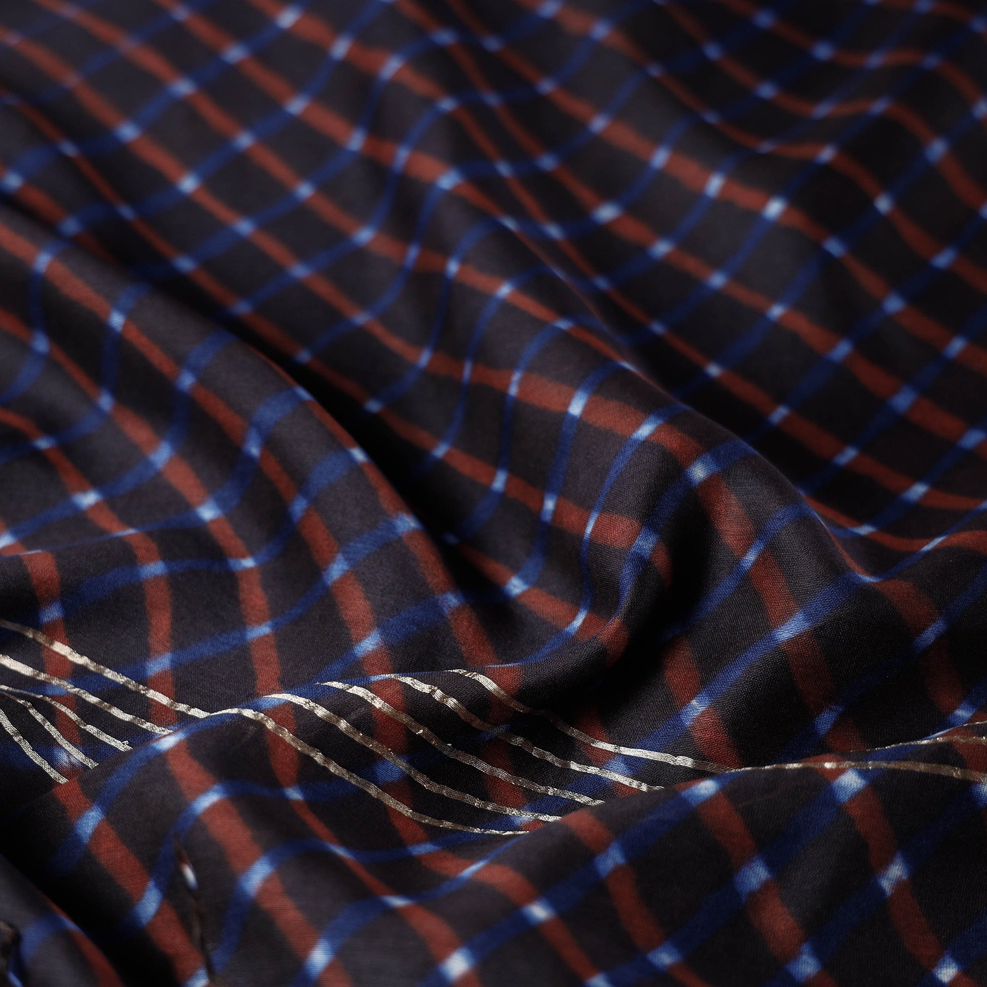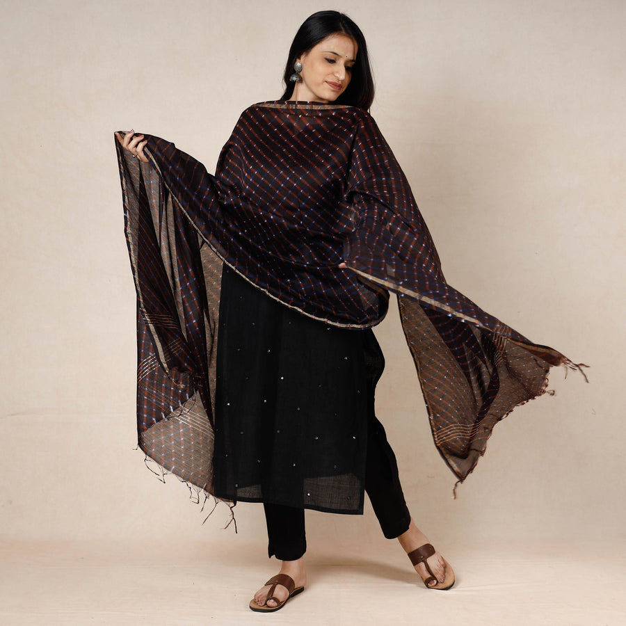 The exquisite craftsmanship of this fine quality brown leheriya tie-dye chanderi silk cotton dupatta. The beautiful wavy patterns on this dupatta are created using the traditional leheriya tie-dye technique by the master artisan family of Badshah Miyan in Rajasthan. Made with azo-free dyes. The blend of chanderi silk and cotton gives it a gossamer look and a luxurious feel. Complete with tassels, this dupatta is a perfect accessory to elevate your outfit and add a touch of elegance to any occasion.