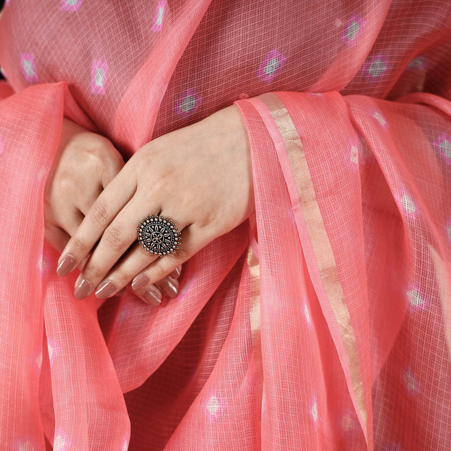 Traditional bandhani tie-dye kota doria silk dupatta with tassels, featuring majestic bandhani pattern, tie-dyed using the traditional technique practised by master artisan family of Badshah Miyan from the state of Rajasthan. The art of Bandhani is highly skilled process. The technique involves dyeing a fabric which is tied tightly with a thread at several points. Kota doria is a blend of strong cotton and lustrous silk yarns, Kota doria is an age-old Indian textile produced in the Kota district of Rajasthan.