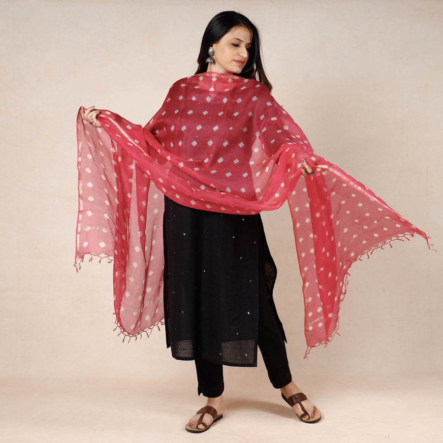 Traditional bandhani tie-dye kota doria silk dupatta with tassels, featuring majestic bandhani pattern, tie-dyed using the traditional technique practised by master artisan family of Badshah Miyan from the state of Rajasthan. The art of Bandhani is highly skilled process. The technique involves dyeing a fabric which is tied tightly with a thread at several points. Kota doria is a blend of strong cotton and lustrous silk yarns, Kota doria is an age-old Indian textile produced in the Kota district of Rajasthan.