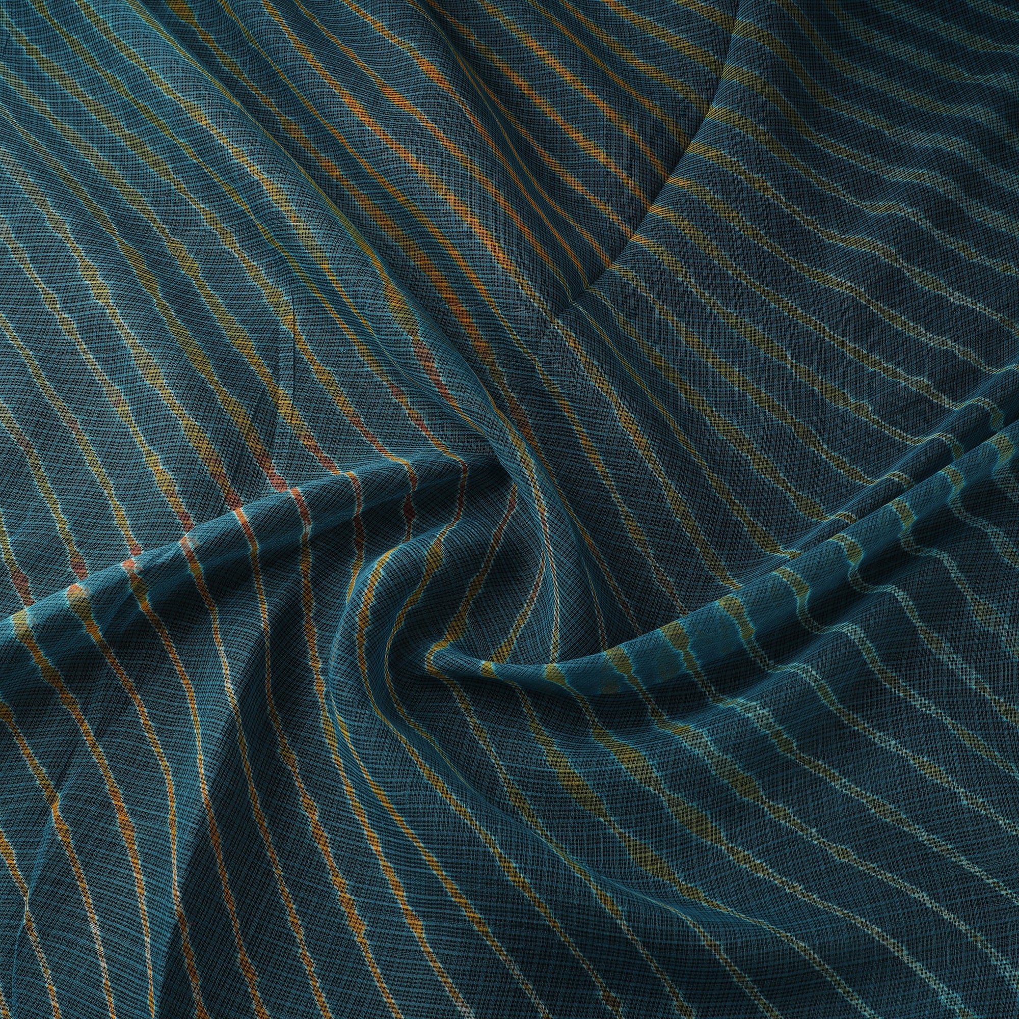 Leheriya tie-dye kota doria cotton fabric features designs inspired by natural wave (leher) patterns formed by the wind across the desert sands of western Rajasthan. These patterns are created using Rajasthan’s traditional tie & dye technique. Leheriya is a centuries-old dyeing tradition deeply rooted in the region’s cultural heritage, practiced by the artisan family of Badshah Miyan. Kota Doria is an age-old Indian textile produced in the Kota district of Rajasthan. The doria, or threads, are finely interwoven to create its characteristic check patterns. Its lightweight and slightly sheer texture give it an exquisite grace and elegance. Comfortable and breathable, it is ideal for kurtas, dupattas, dresses, sarees, and decor, making it a versatile choice for both everyday and occasion styling.