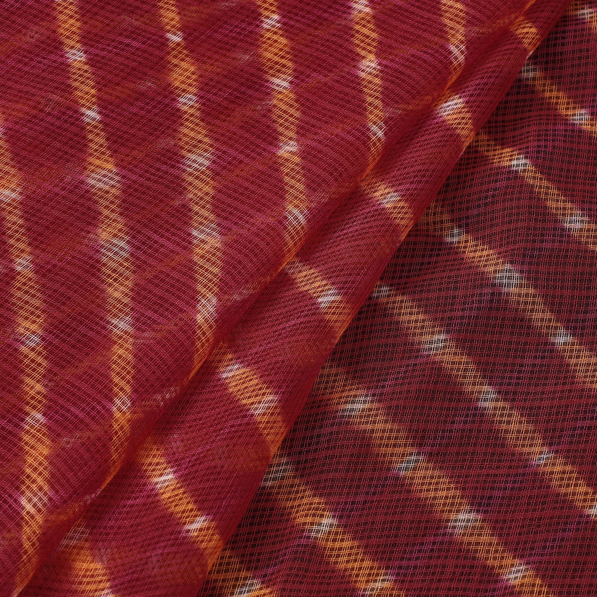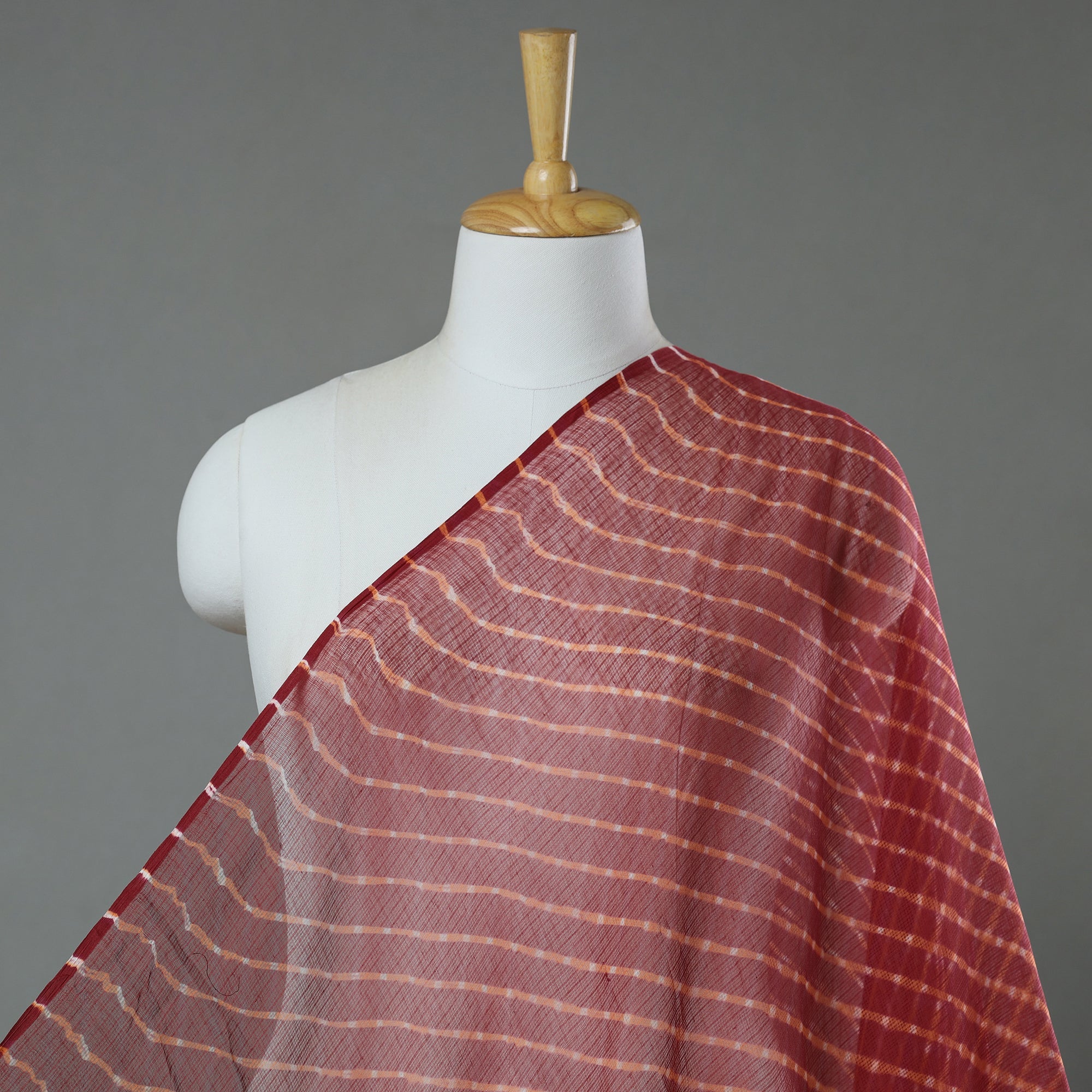 This fine quality red original leheriya tie-dye kota doria cotton fabric. This fabric features wavy patterns created using the traditional leheriya tie & dye technique, dyed with azo-free dyes. It is handcrafted by the master artisan family of Badshah Miyan from the state of Rajasthan, known for their expertise in this traditional art form. Made from high-quality Kota Doria cotton, this fabric is lightweight, sheer, and perfect for creating stylish and unique garments. Add a touch of Rajasthan's rich cultural heritage to your wardrobe with this exquisite leheriya tie-dye Kota Doria fabric.