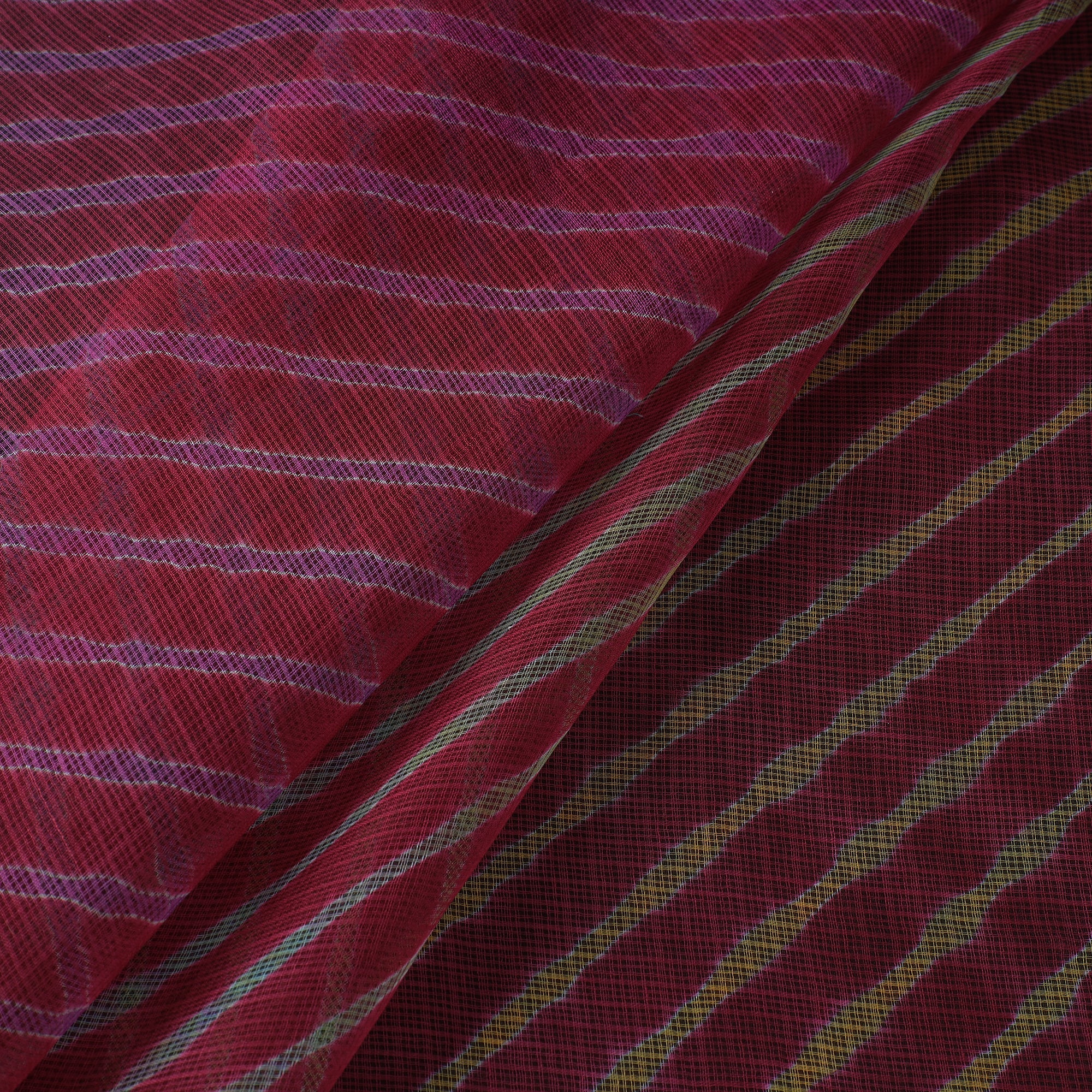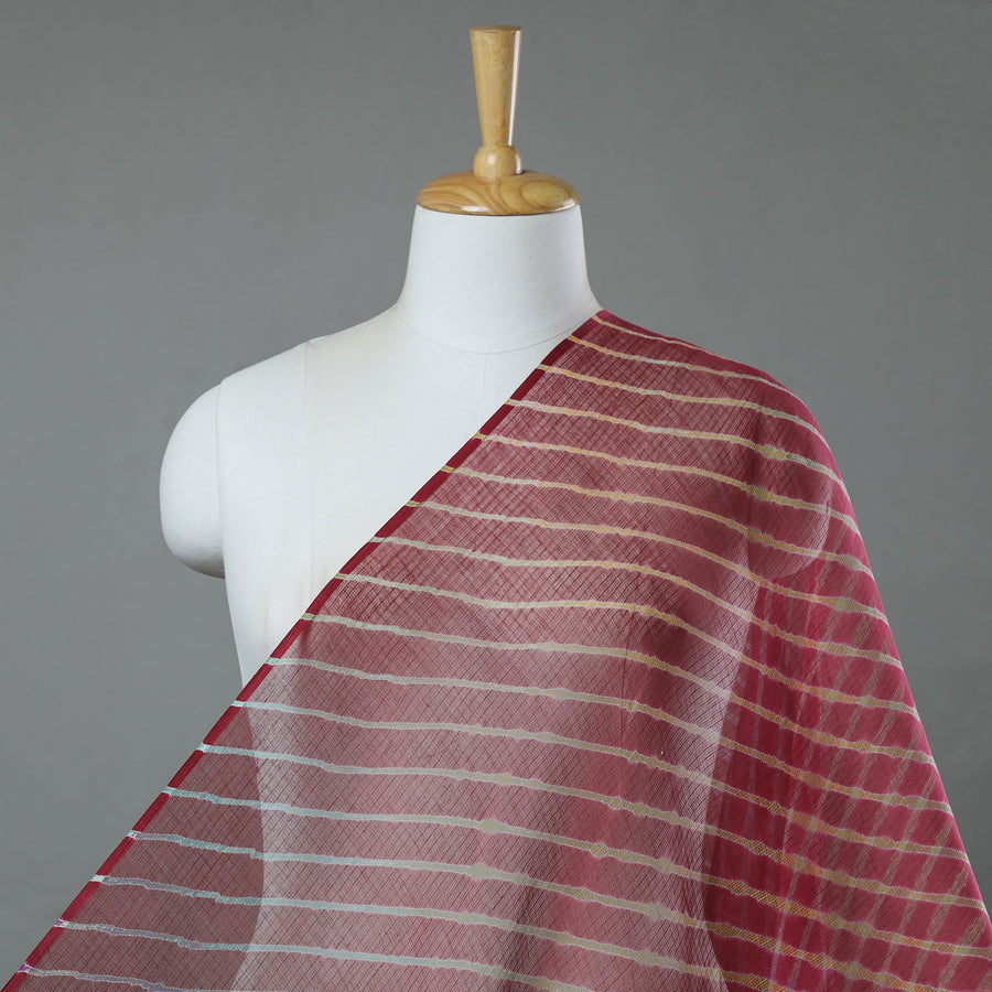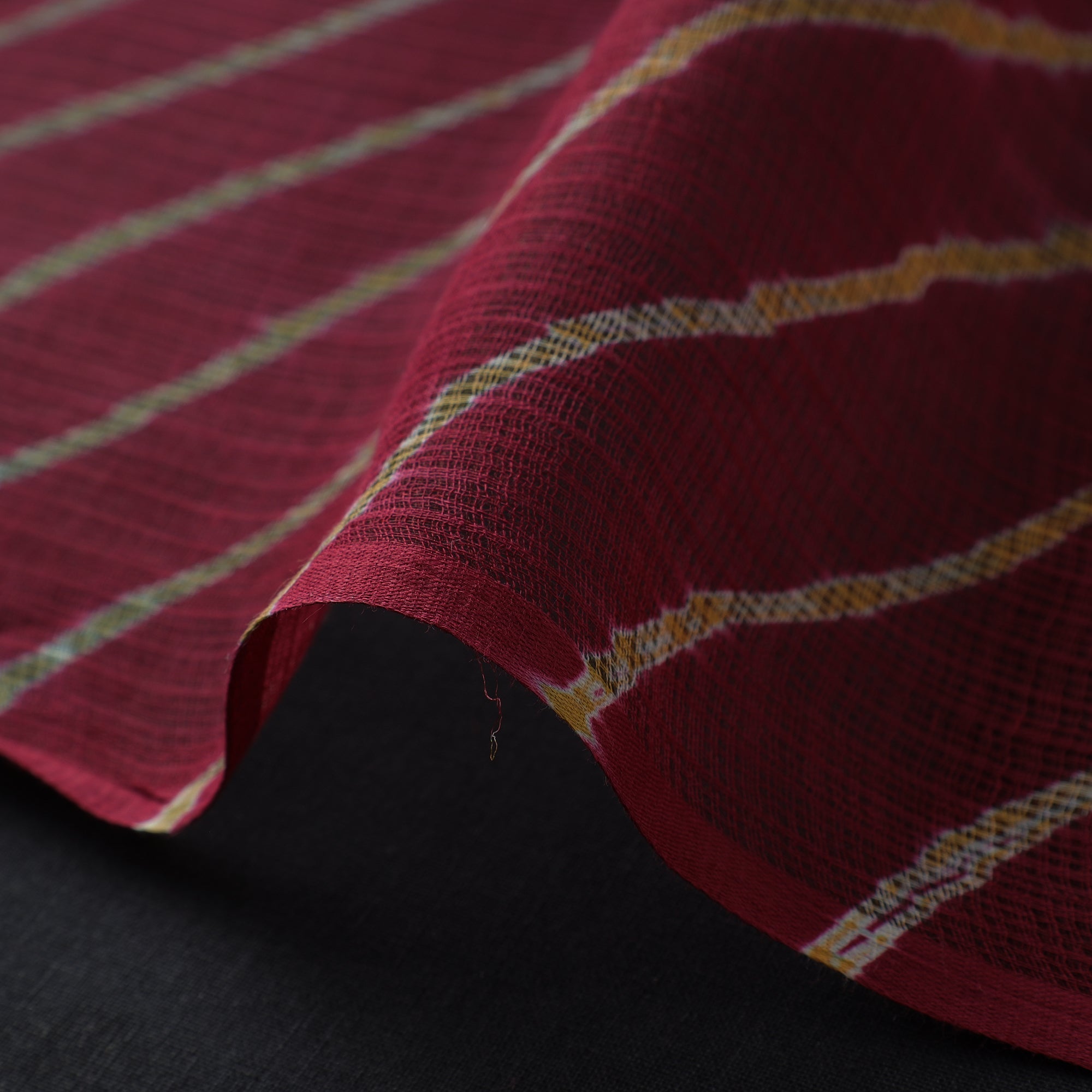 This fine quality maroon original leheriya tie-dye kota doria cotton fabric. This fabric features wavy patterns created using the traditional leheriya tie & dye technique, dyed with azo-free dyes. It is handcrafted by the master artisan family of Badshah Miyan from the state of Rajasthan, known for their expertise in this traditional art form. Made from high-quality Kota Doria cotton, this fabric is lightweight, sheer, and perfect for creating stylish and unique garments. Add a touch of Rajasthan's rich cultural heritage to your wardrobe with this exquisite leheriya tie-dye Kota Doria fabric.
