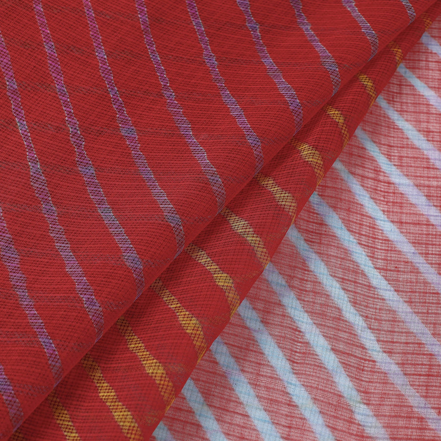 This fine quality red original leheriya tie-dye kota doria cotton fabric. This fabric features wavy patterns created using the traditional leheriya tie & dye technique, dyed with azo-free dyes. It is handcrafted by the master artisan family of Badshah Miyan from the state of Rajasthan, known for their expertise in this traditional art form. Made from high-quality Kota Doria cotton, this fabric is lightweight, sheer, and perfect for creating stylish and unique garments. Add a touch of Rajasthan's rich cultural heritage to your wardrobe with this exquisite leheriya tie-dye Kota Doria fabric.