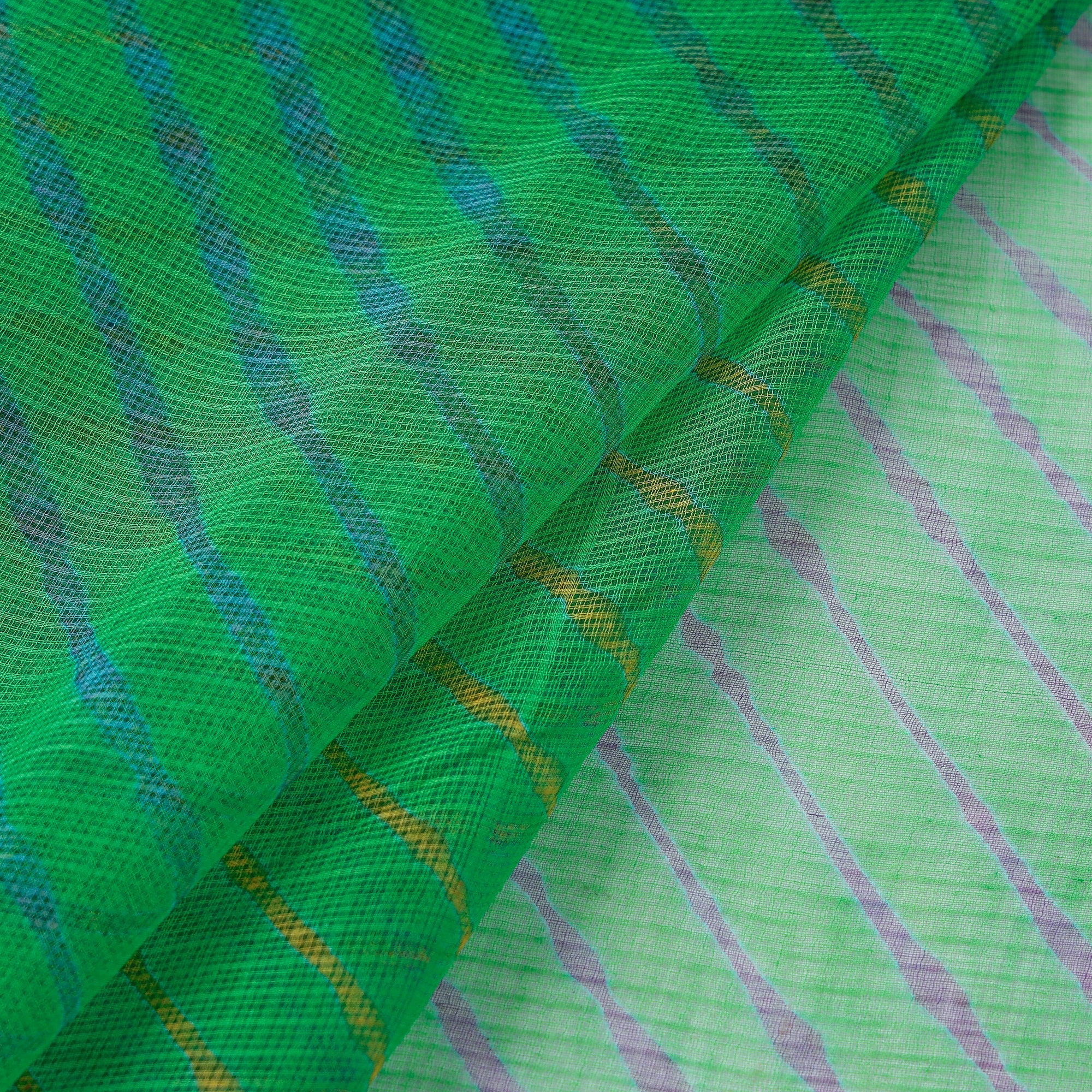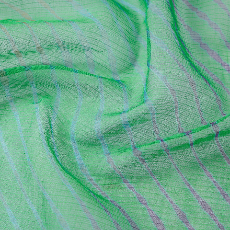 This fine quality green original leheriya tie-dye kota doria cotton fabric. This fabric features wavy patterns created using the traditional leheriya tie & dye technique, dyed with azo-free dyes. It is handcrafted by the master artisan family of Badshah Miyan from the state of Rajasthan, known for their expertise in this traditional art form. Made from high-quality Kota Doria cotton, this fabric is lightweight, sheer, and perfect for creating stylish and unique garments. Add a touch of Rajasthan's rich cultural heritage to your wardrobe with this exquisite leheriya tie-dye Kota Doria fabric.