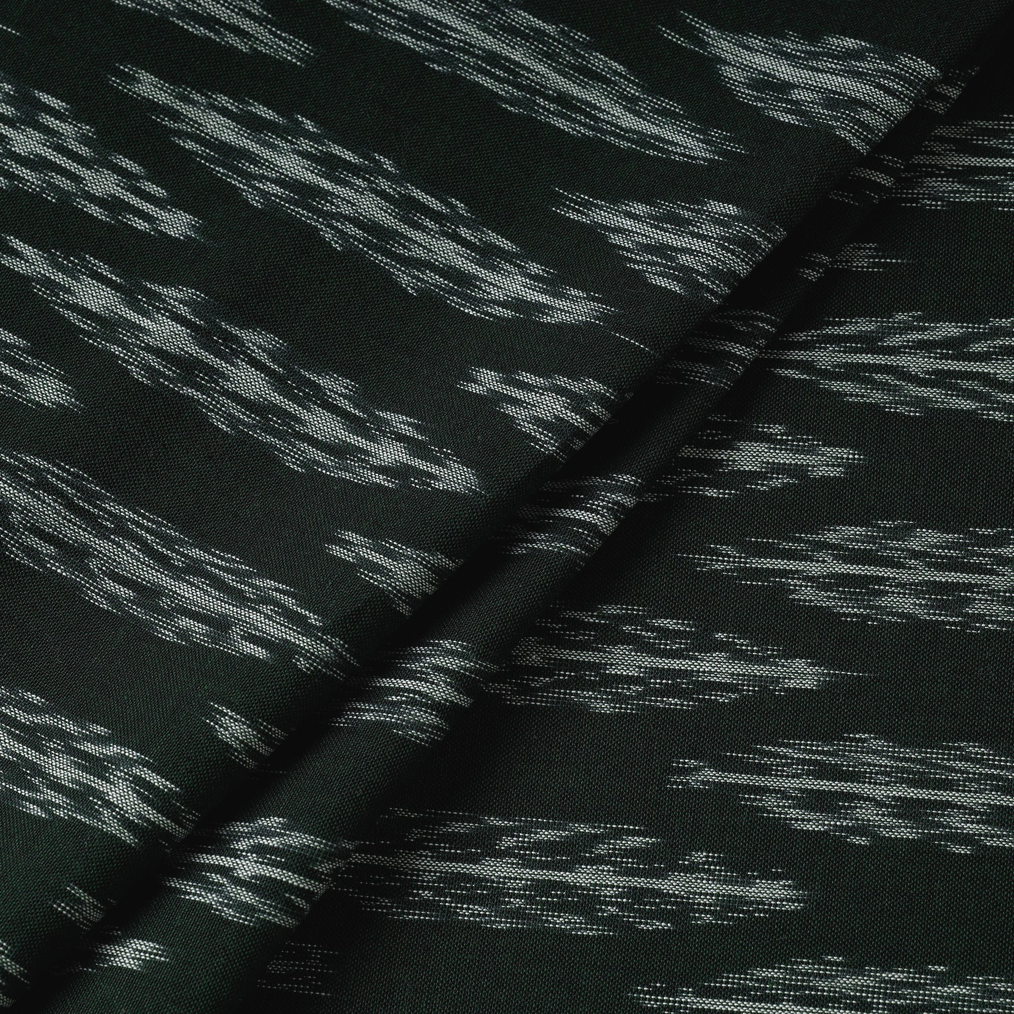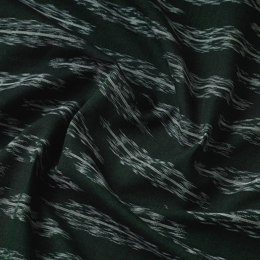 Fine-quality traditional phthalo green pochampally double ikat handloom pure cotton fabric from Telangana. Ikat (Ikkat) is a dyeing technique used to pattern textiles that employs a resist dyeing process similar to tie-dye on either the warp or weft fibres prior to dyeing. Ikat has lovely patterns and is world-famous for its extremely beautiful colours, textures, and designs. Indian Ikat is always admired by fashion designers around the world. This piece carries tiny knots, thread pulls, or uneven lines — not flaws, but fingerprints. Every irregularity is a whisper from the hands that made it. It’s what happens when tradition weaves through time, not machines. If you’re looking for perfection, this isn’t it. But if you’re looking for soul — you’ve found it.