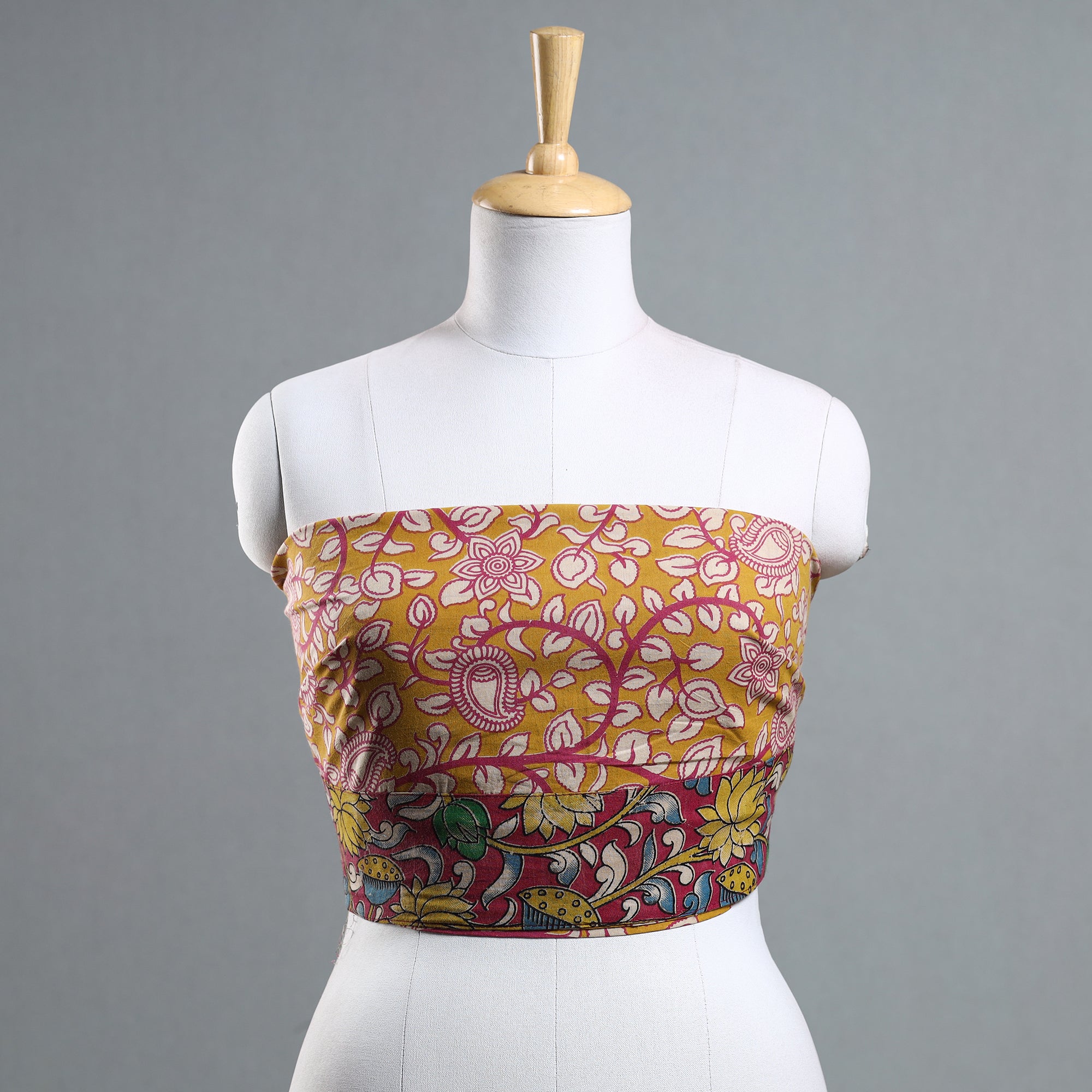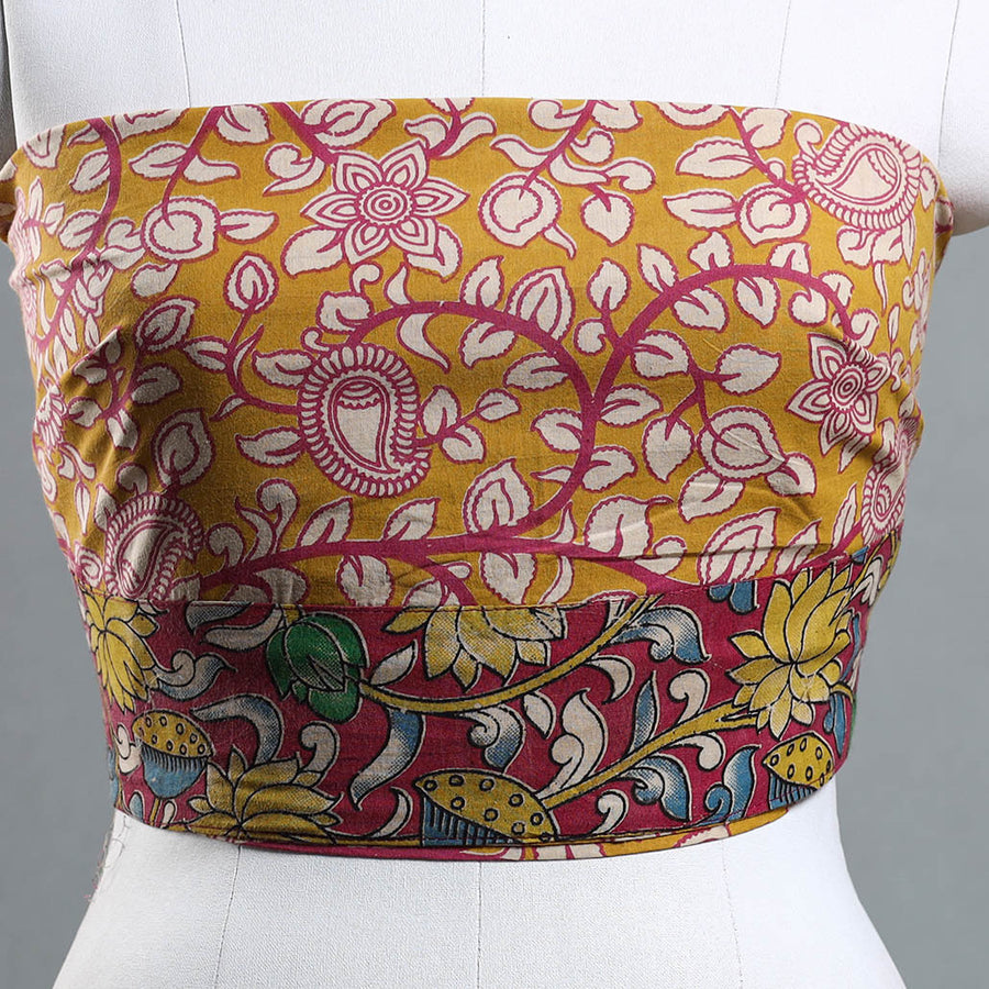 Fine quality kalamkari printed cotton blouse piece crafted with traditional handmade textiles of India. This mix and match blouse material is perfect to pair with any saree, adding a touch of elegance to your ensemble. Made with the finest quality materials, this blouse material ensures comfort and style, making it a must-have addition to your wardrobe.