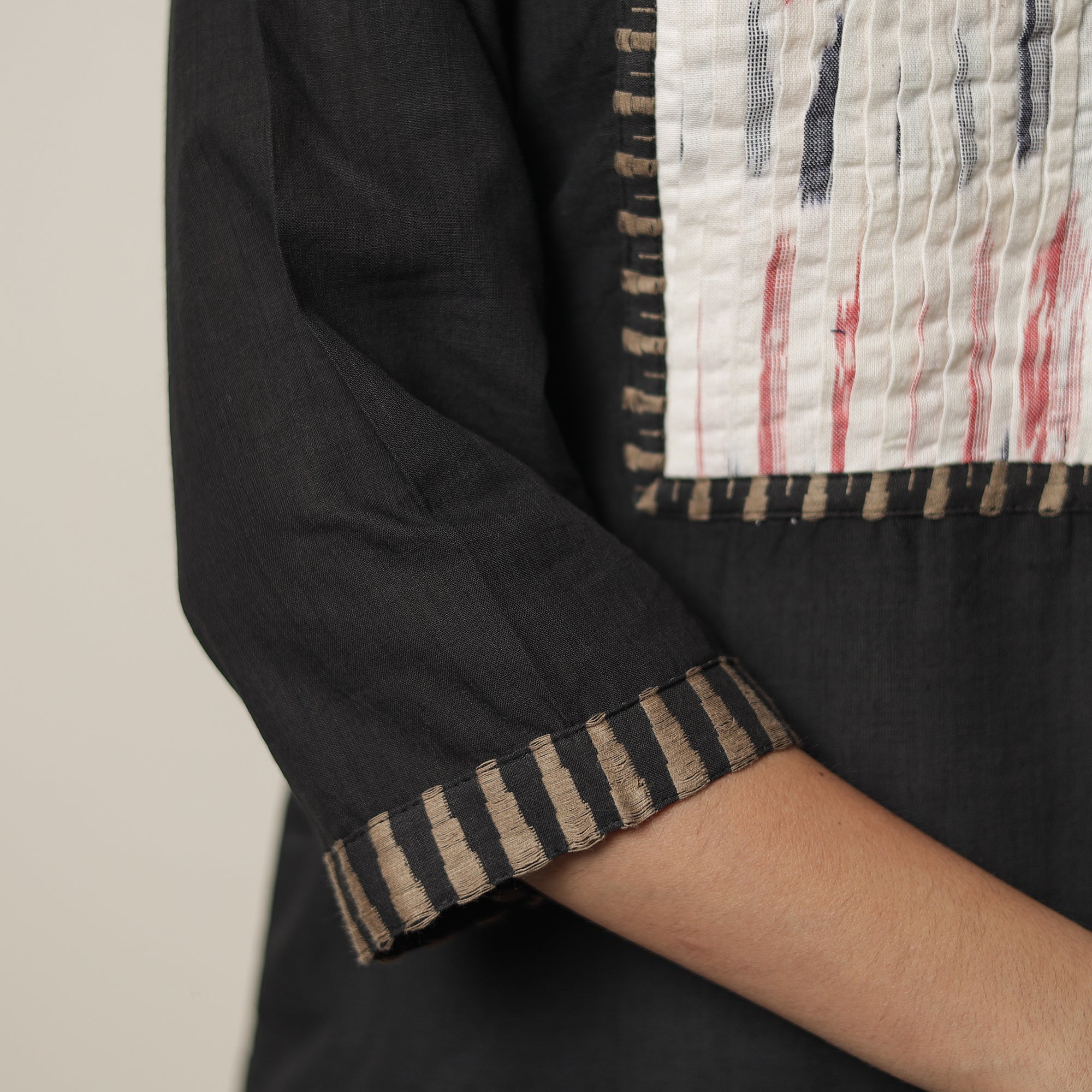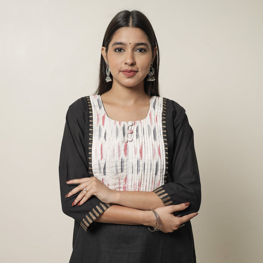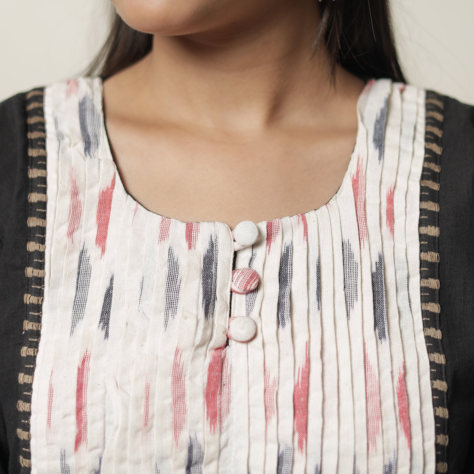 Look and feel beautiful in this uniquely designed dharwad cotton long kurta with pintuck ikat patchwork. This exquisite kurta is crafted from fine-quality cotton fabric, ensuring a comfortable feel against your skin. It boasts an exquisite pintuck ikat patchwork designs, adding a touch of elegance to your ensemble. The kurta also features a convenient one-side pocket, perfect for carrying small essentials. This cotton kurta makes you comfortable all day long. This kurta is perfect for your daily outing and for a special occasion.