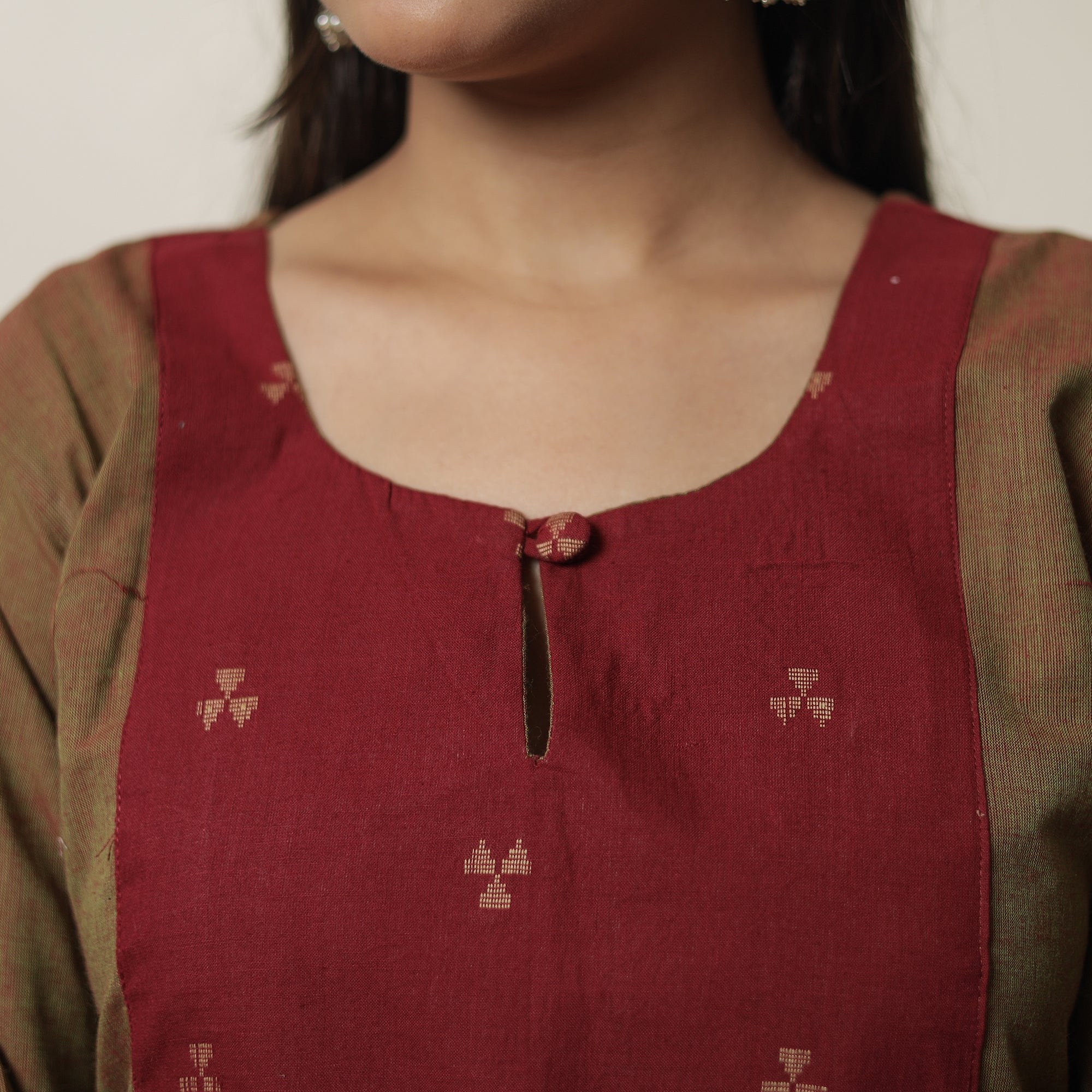 Look and feel beautiful in this uniquely designed dharwad cotton long kurta with jacquard patchwork. This exquisite kurta is crafted from fine-quality cotton fabric, ensuring a comfortable feel against your skin. It boasts an exquisite jacquard patchwork designs, adding a touch of elegance to your ensemble. The kurta also features a convenient one-side pocket, perfect for carrying small essentials. This cotton kurta makes you comfortable all day long. This kurta is perfect for your daily outing and for a special occasion.