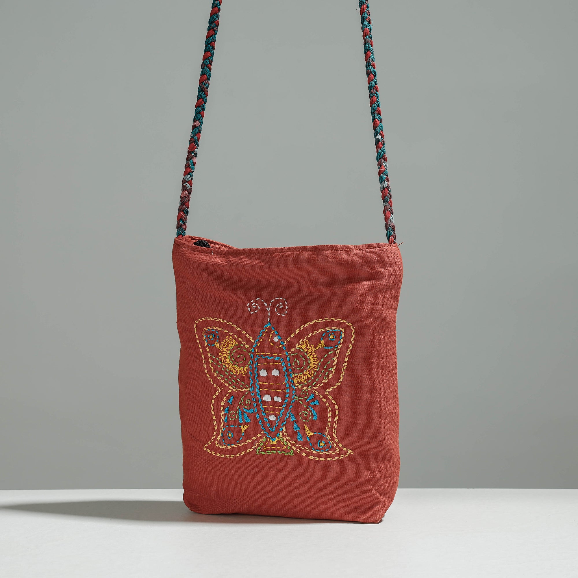 Indulge the beautifully brown handcrafted gamcha fabric cotton hand embroidered sling bag by Rangila Dhaga. It has one zipper pocket inside. This exquisite sling bag is a true testament to the skilled craftsmanship and artistic vision of the artisans behind it. Made from soft and durable gamcha fabric, this hand embroidered sling bag offers a unique contemporary style.