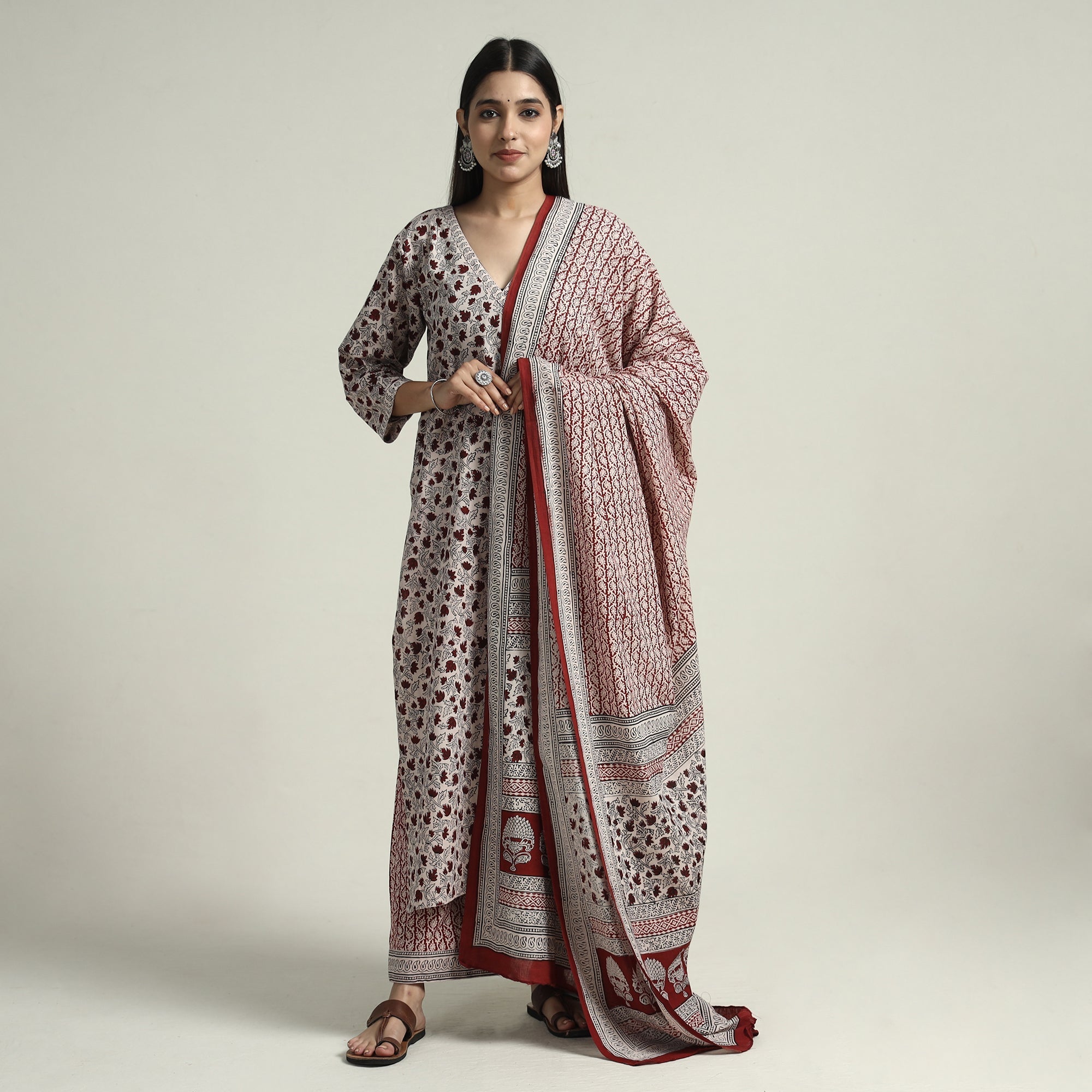 | Material | This bagh block printed cotton stitched kurta with palazzo & dupatta set is the perfect blend of comfort and style. This suit set is made of natural dyed fabric. This kurta set is crafted from cotton fabric, ensuring a comfortable feel against your skin. The kurta also features a convenient one-side pocket, perfect for carrying small essentials, and the palazzo features an elasticized waist and two side pockets, adding functionality to this palazzo. Perfect for special occasions, this suit set combines fashion and functionality effortlessly, ensuring you look and feel beautiful with ease. |