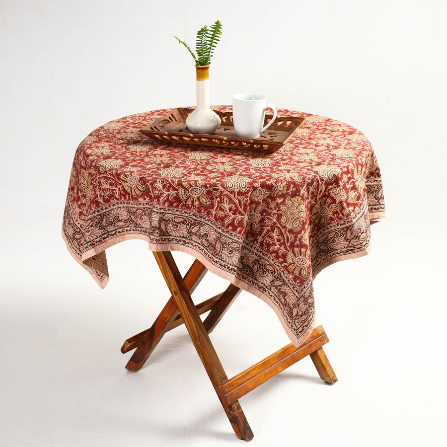 Elevate your dining experience with our red pedana kalamkari hand-block-print table cover. Meticulously crafted by skilled artisans, this fine-quality cotton cover showcases intricate designs using natural dyes. Its rich aesthetic adds a touch of elegance to any table setting, making it perfect for special occasions or everyday use.
