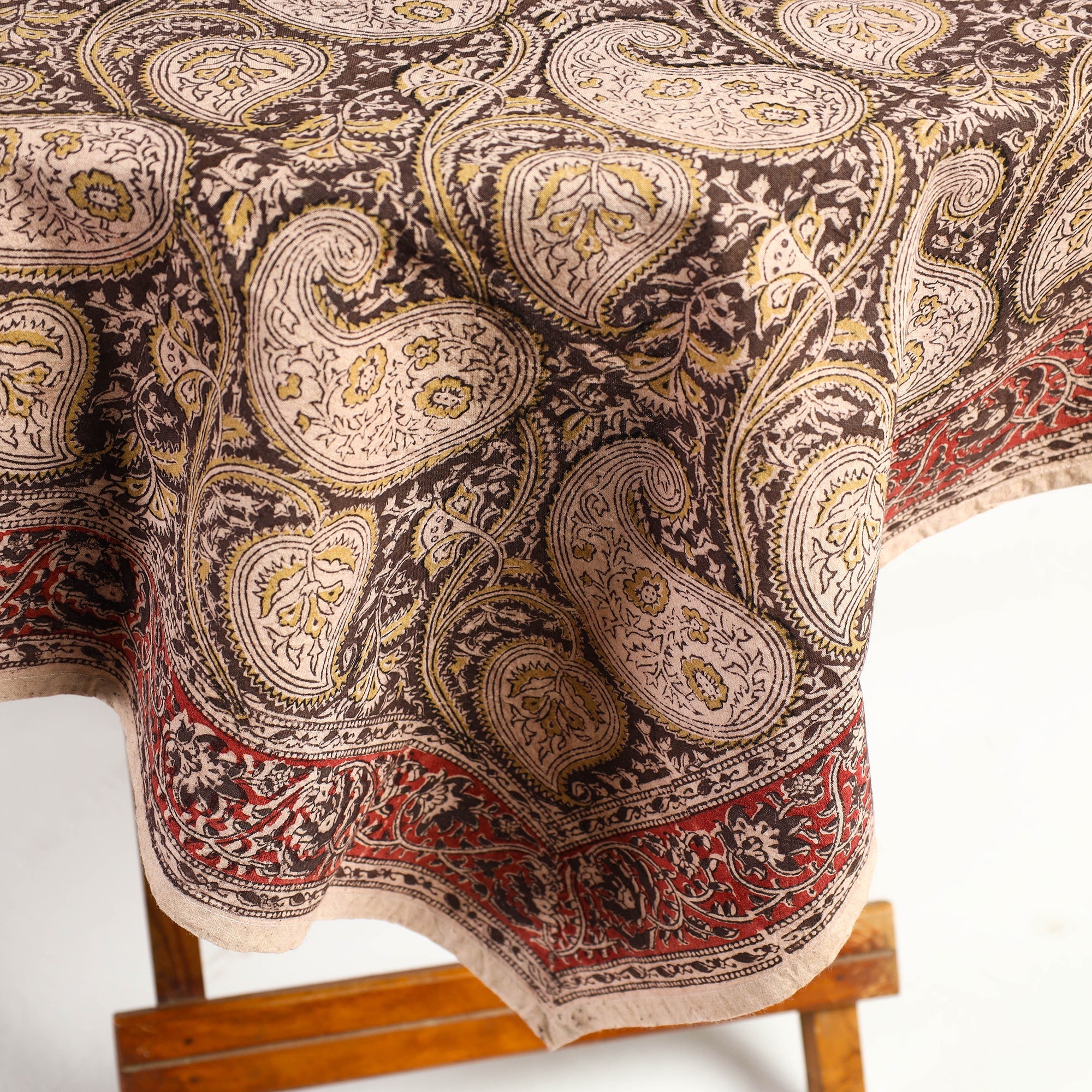 Elevate your dining experience with our beige pedana kalamkari hand-block-print table cover. Meticulously crafted by skilled artisans, this fine-quality cotton cover showcases intricate designs using natural dyes. Its rich aesthetic adds a touch of elegance to any table setting, making it perfect for special occasions or everyday use.