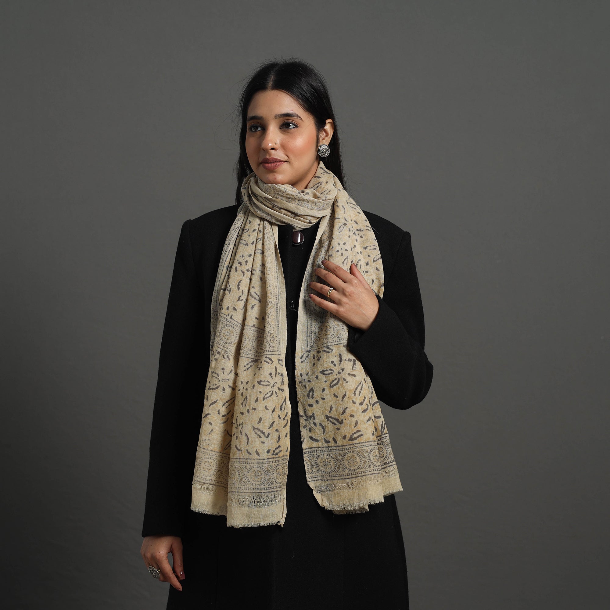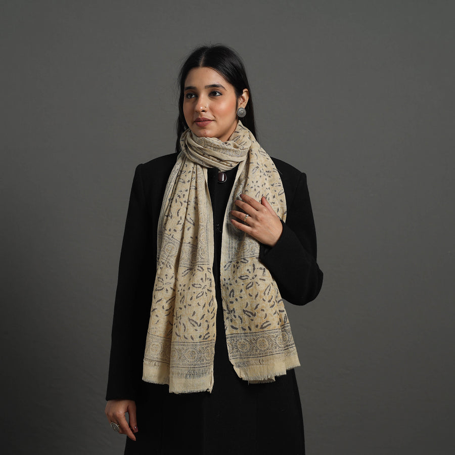 Elevate your style with this fine quality beige pedana kalamkari hand block print wool stole. This exquisite stole is adorned with intricate hand block print designs using natural dyes, an identification of authentic Kalamkari artistry. The wool construction offers exceptional warmth and softness, making it perfect for cold weather. This stole can elevate any outfit. It's versatile, suitable for both formal and casual occasions, adding a touch of traditional Indian artistry to your style.