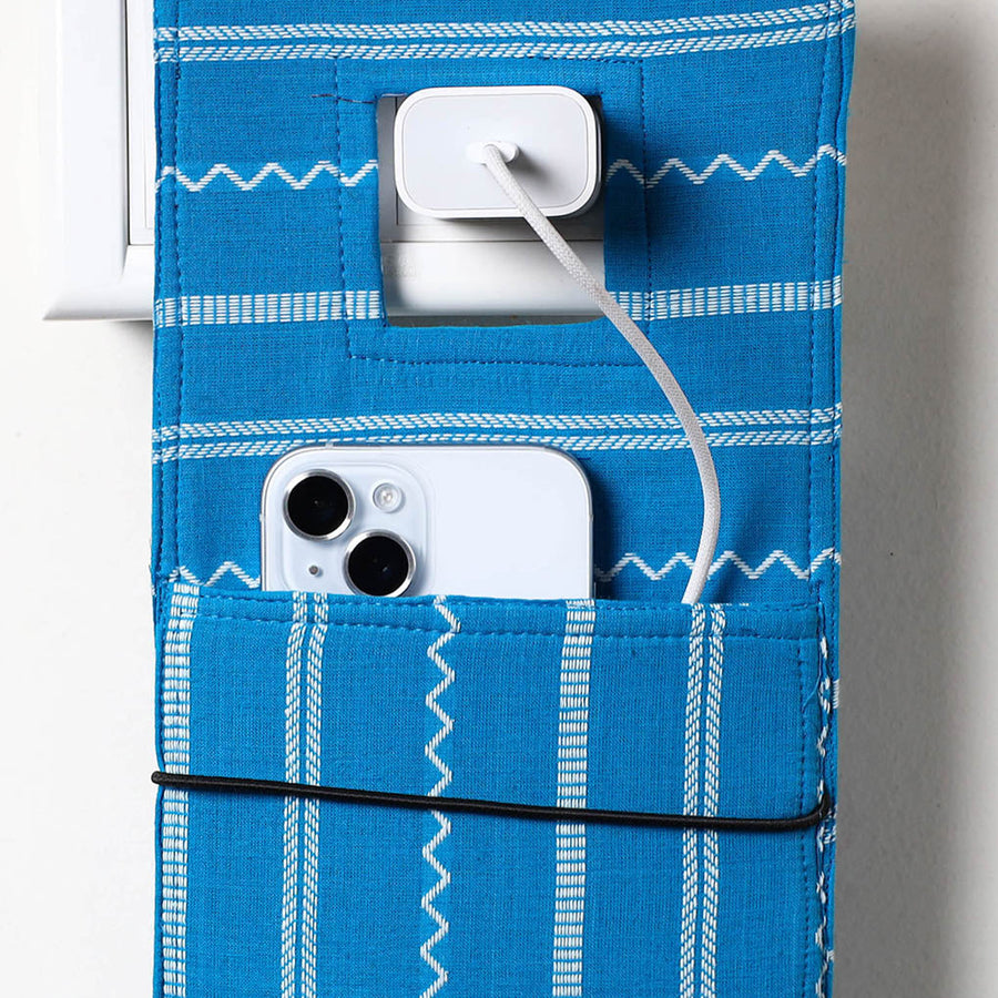 Handmade blue jacquard weave mobile charging holder made up with cotton fabric. Premium-quality fabric is used to make it soft and comfy. It's quite handy and portable while traveling. It keeps your phone safe and protected. It's very convenient during charging your mobile phone. It comes in different colors.