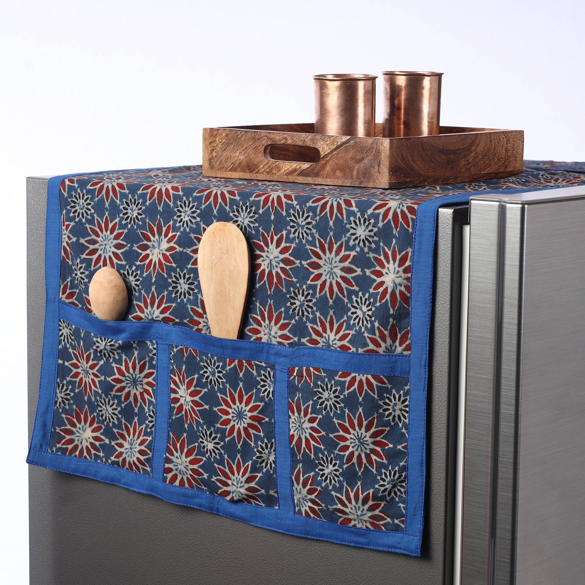 Transform your kitchen with the blue ajrakh block printed cotton fridge top cover. Crafted with intricate block prints, this cover exudes traditional charm is textured with handmade textiles from India. Featuring six utility side pockets, it ensures your daily essentials are conveniently organized. Perfect for adding a touch of traditional Indian style to your kitchen while keeping it organized. Enhance your kitchen's with this unique fridge top cover, adding a traditional Indian touch while keeping your space neat and organized. Perfect for those who appreciate a fusion of cultural elegance and utility.