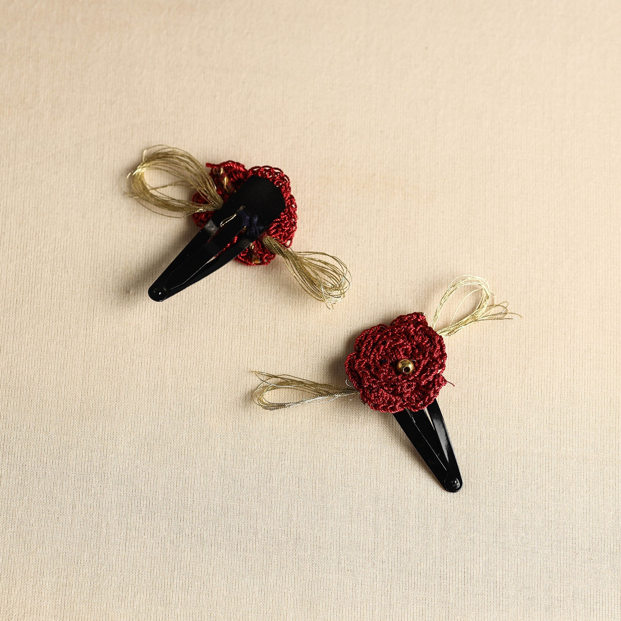 Elevate your hairdo with our handmade maroon crochet tik-tak hair clip, a charming accessory crafted with precision and care. Perfect for securing loose locks or embellishing ponytails, it effortlessly elevates your look with a trendy, handmade touch.