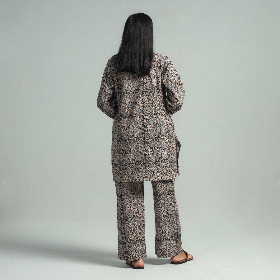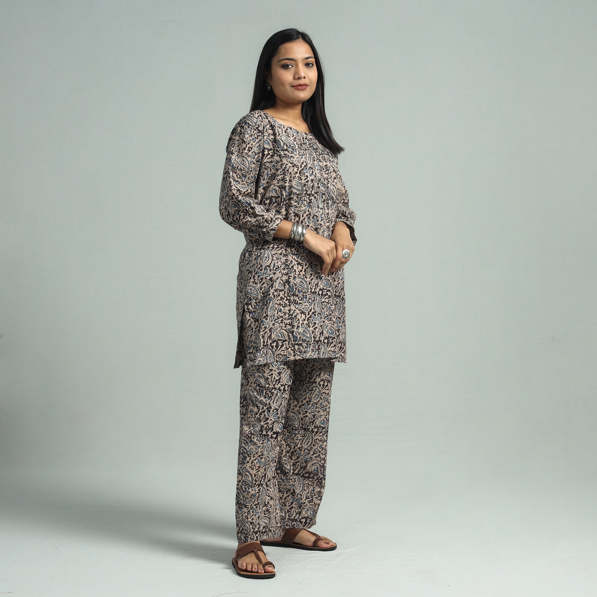 Stay comfortable and stylish with our pedana kalamkari block printed cotton two-piece Co-ord set. The set features an elasticated waist pant and a top with one side pocket. Crafted from pedana kalamkari hand block printed natural dyed cotton fabric, this two-piece Co-ord set offers comfort and breathability. The soft elasticized waist pant ensures a great fit, while the two side pockets add functionality. The unique design ensures a beautiful and comfortable fit. Stay relaxed and chic all day long in this stunning co-ord set that is perfect for any occasion.