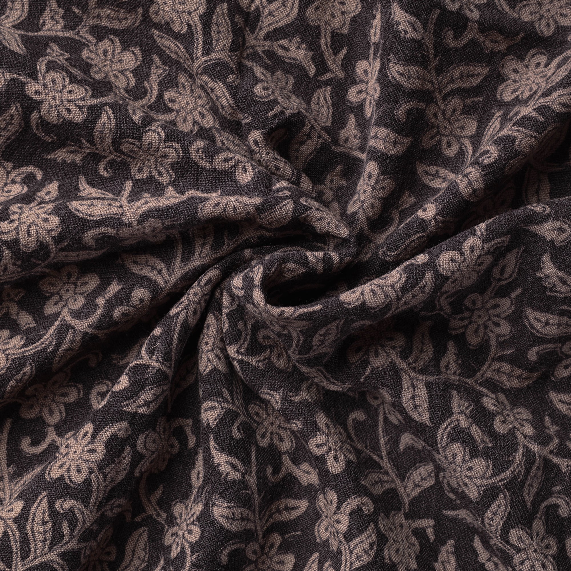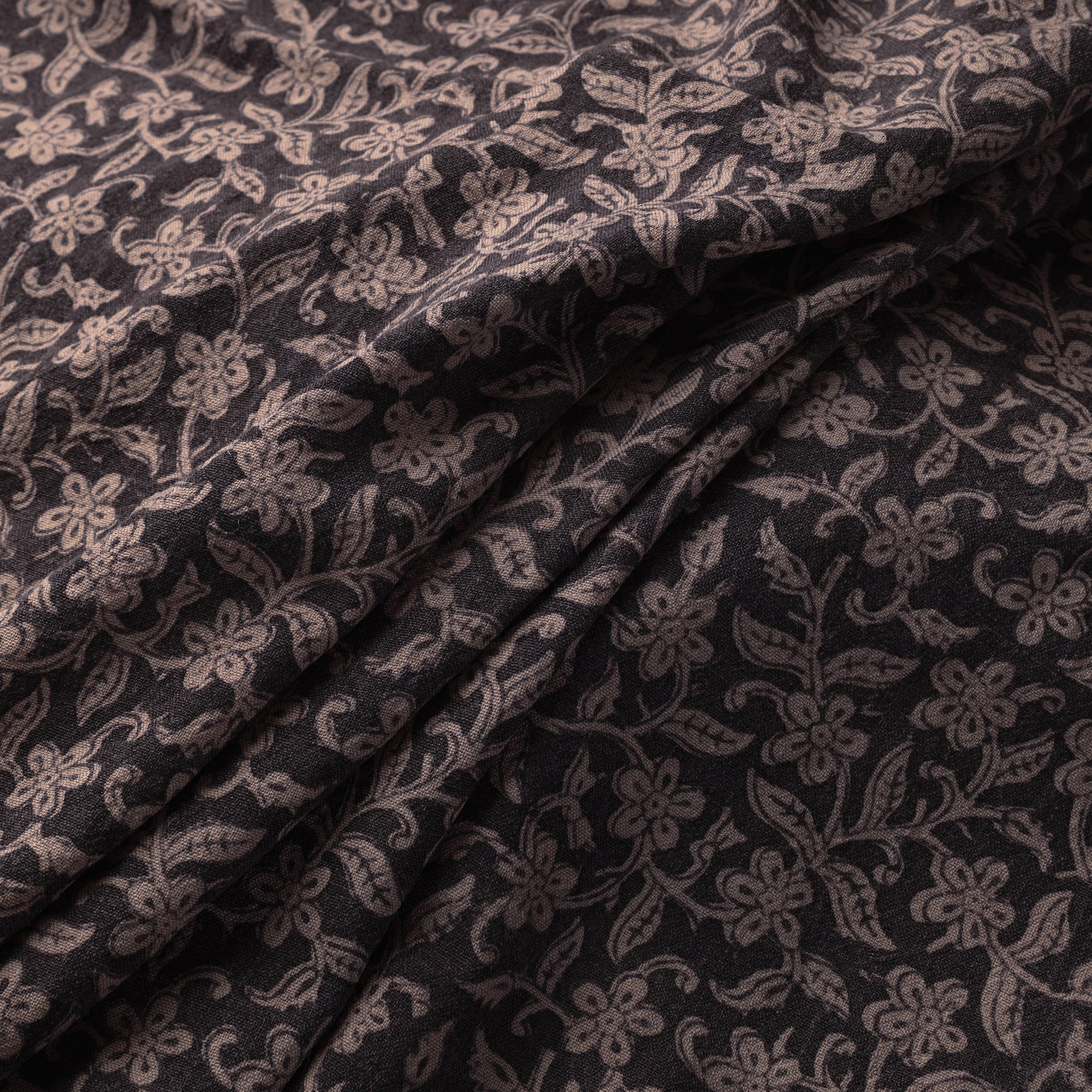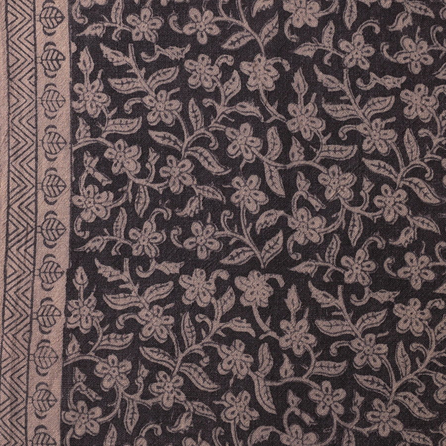 Fine-quality black bagh hand block printed merino wool handloom fabric. Meticulously made by master artisan Umar Faruk Khatri, who practices the age-old art of Bagh block printing in the Dhar district of Madhya Pradesh, this fabric is a testament to skilled artistry. Using natural dyes and following traditional processes, each motif and pattern on the fabric is carefully hand block printed, creating a unique and exquisite design. This wool fabric offers exceptional comfort, keeping you cozy in cold weather while allowing your skin to breathe, making it perfect for all-day wear. This fabric can be fashioned into elegant shawls, scarves, or clothing, adding a touch of warmth and sophistication to your wardrobe, or cherished as a unique heirloom.