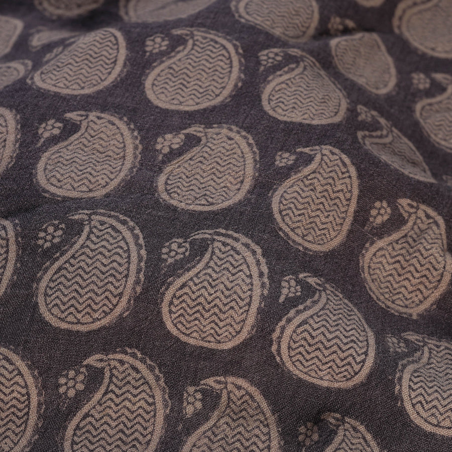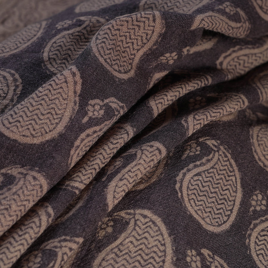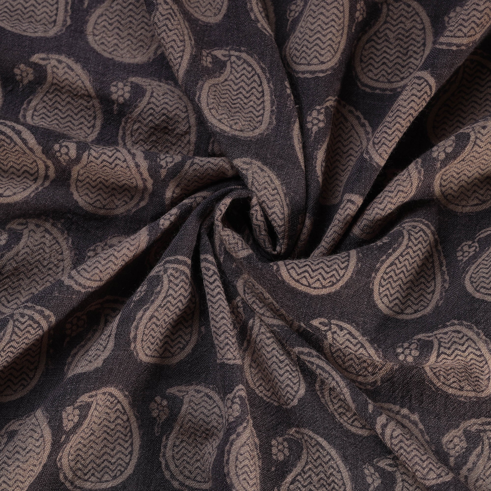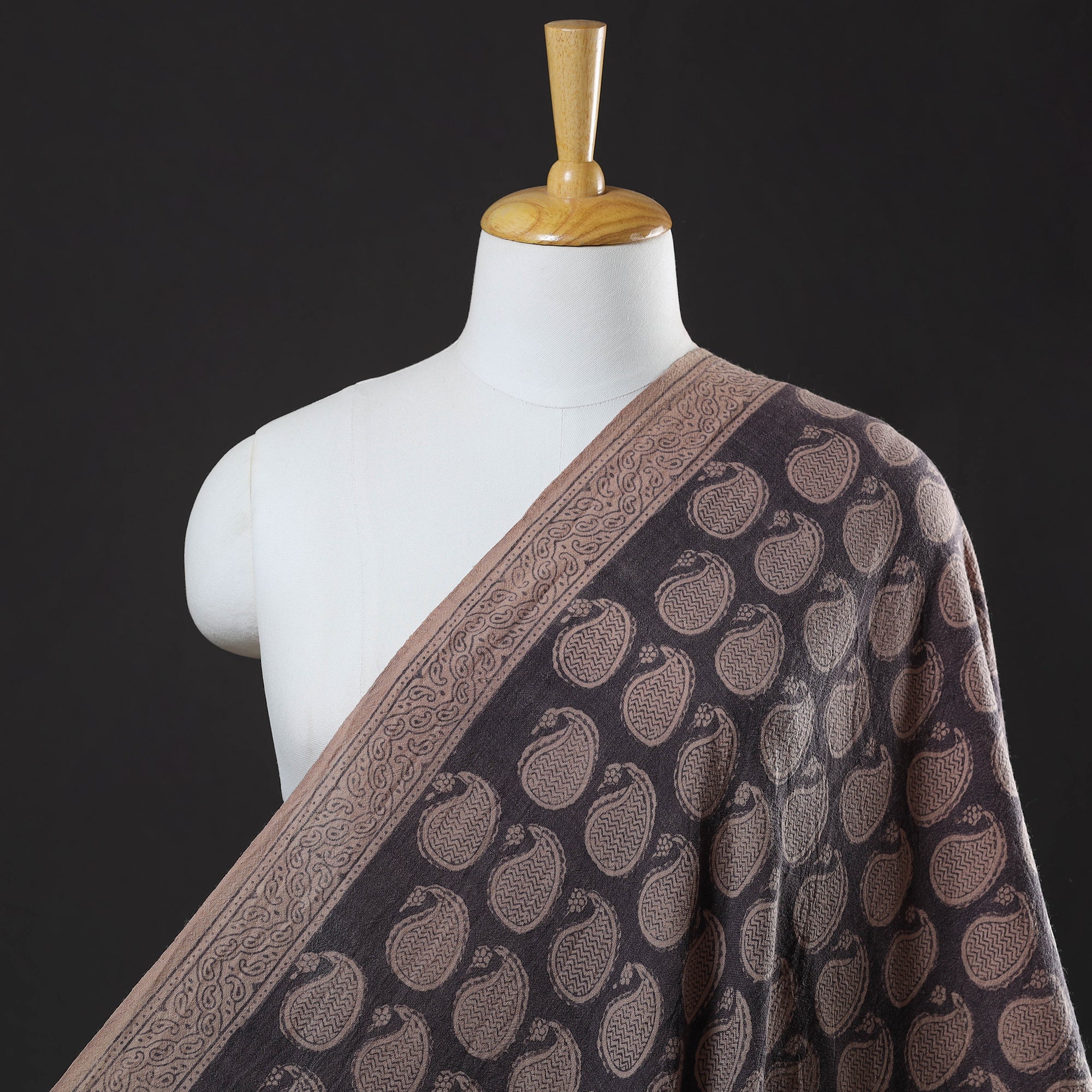 Fine-quality black bagh hand block printed merino wool handloom fabric. Meticulously made by master artisan Umar Faruk Khatri, who practices the age-old art of Bagh block printing in the Dhar district of Madhya Pradesh, this fabric is a testament to skilled artistry. Using natural dyes and following traditional processes, each motif and pattern on the fabric is carefully hand block printed, creating a unique and exquisite design. This wool fabric offers exceptional comfort, keeping you cozy in cold weather while allowing your skin to breathe, making it perfect for all-day wear. This fabric can be fashioned into elegant shawls, scarves, or clothing, adding a touch of warmth and sophistication to your wardrobe, or cherished as a unique heirloom.