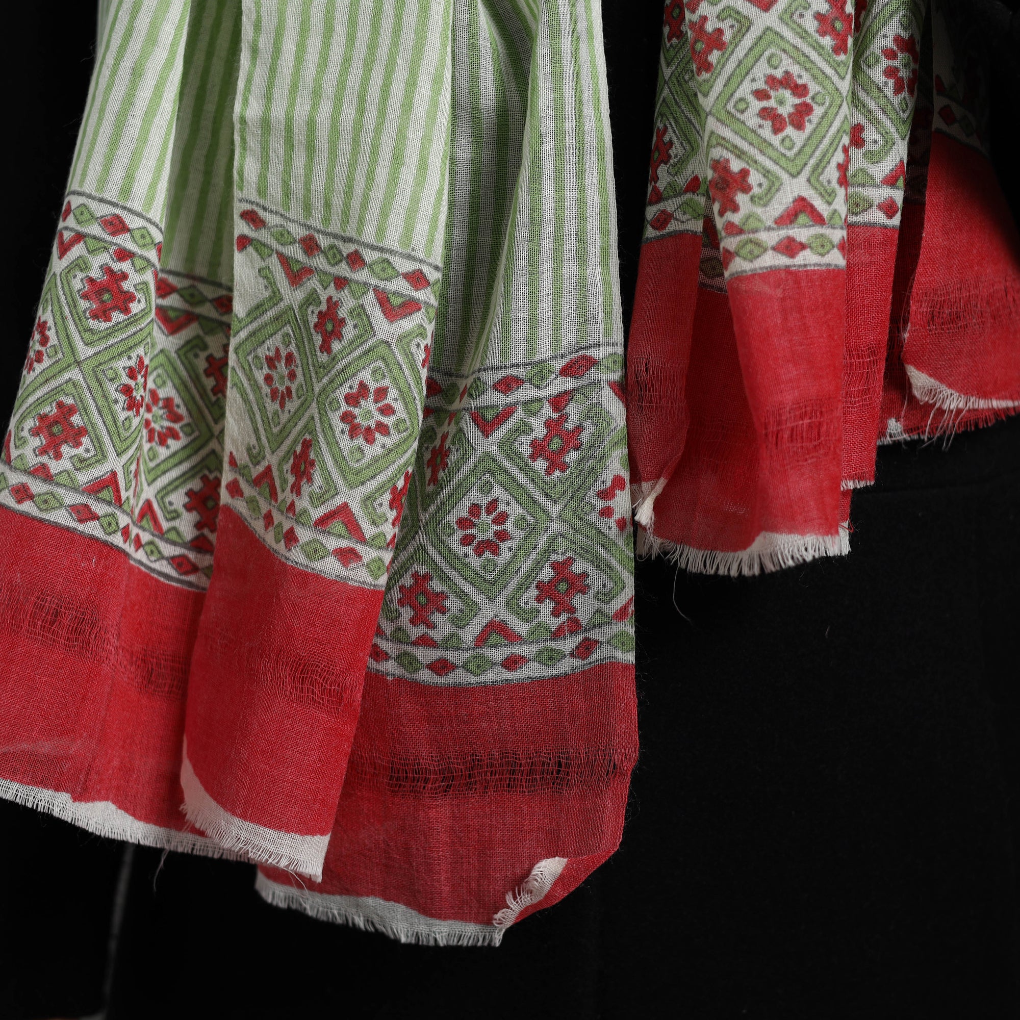 Experience the rich heritage of Rajasthan with our pure wool green block print sanganeri stole. The pure wool construction offers exceptional warmth and softness, making it perfect for cold weather. The bleed-free VAT dyes ensure lasting vibrancy. The elaborate detailing of the flowers and petals showcases the artistry of this hand-block printing technique originating from Sanganer, Rajasthan. Embrace timeless elegance and support artisanal craftsmanship with this unique accessory.