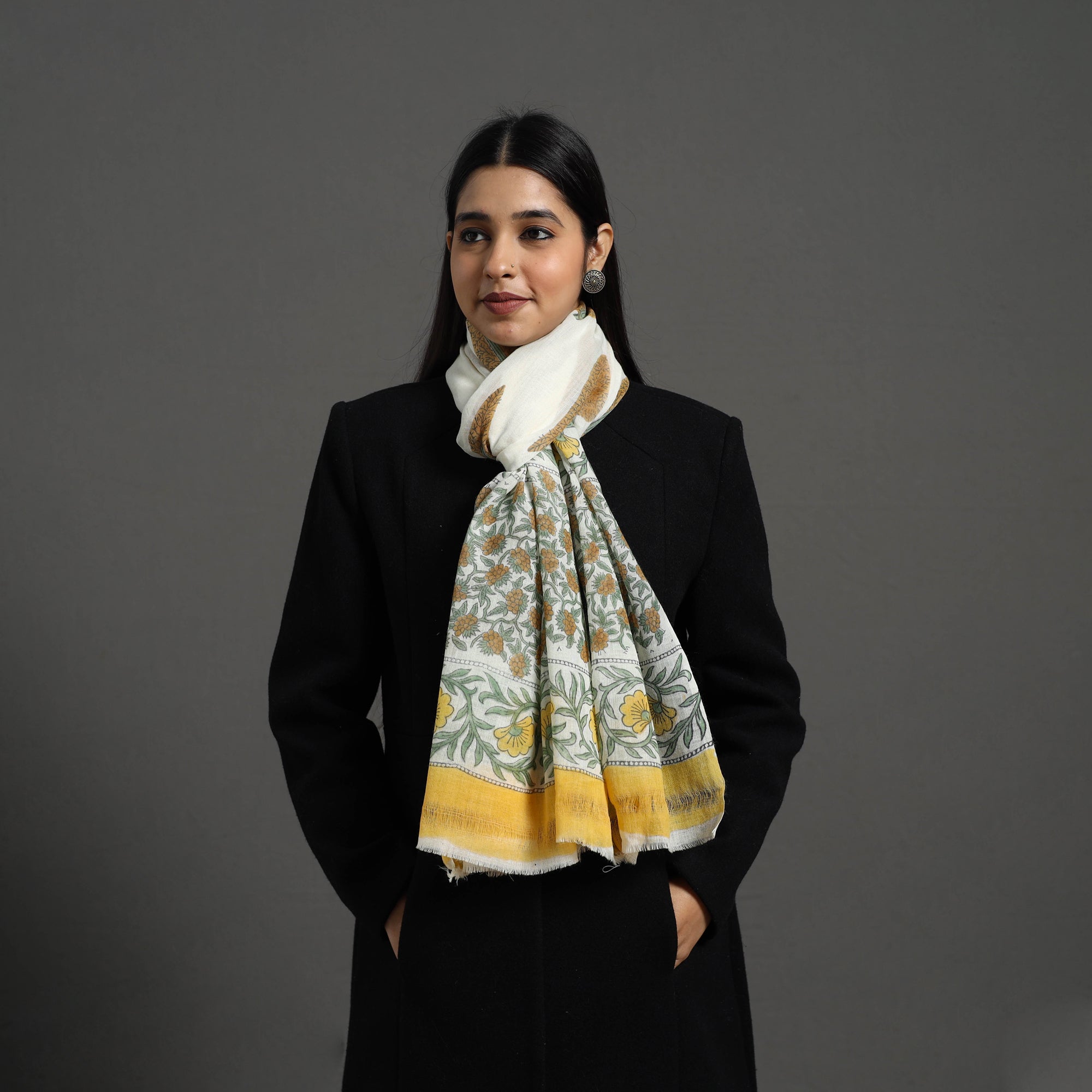 Experience the rich heritage of Rajasthan with our yellow pure wool block print sanganeri stole. The pure wool construction offers exceptional warmth and softness, making it perfect for cold weather. The bleed-free VAT dyes ensure lasting vibrancy. The elaborate detailing of the flowers and petals showcases the artistry of this hand-block printing technique originating from Sanganer, Rajasthan. Embrace timeless elegance and support artisanal craftsmanship with this unique accessory.