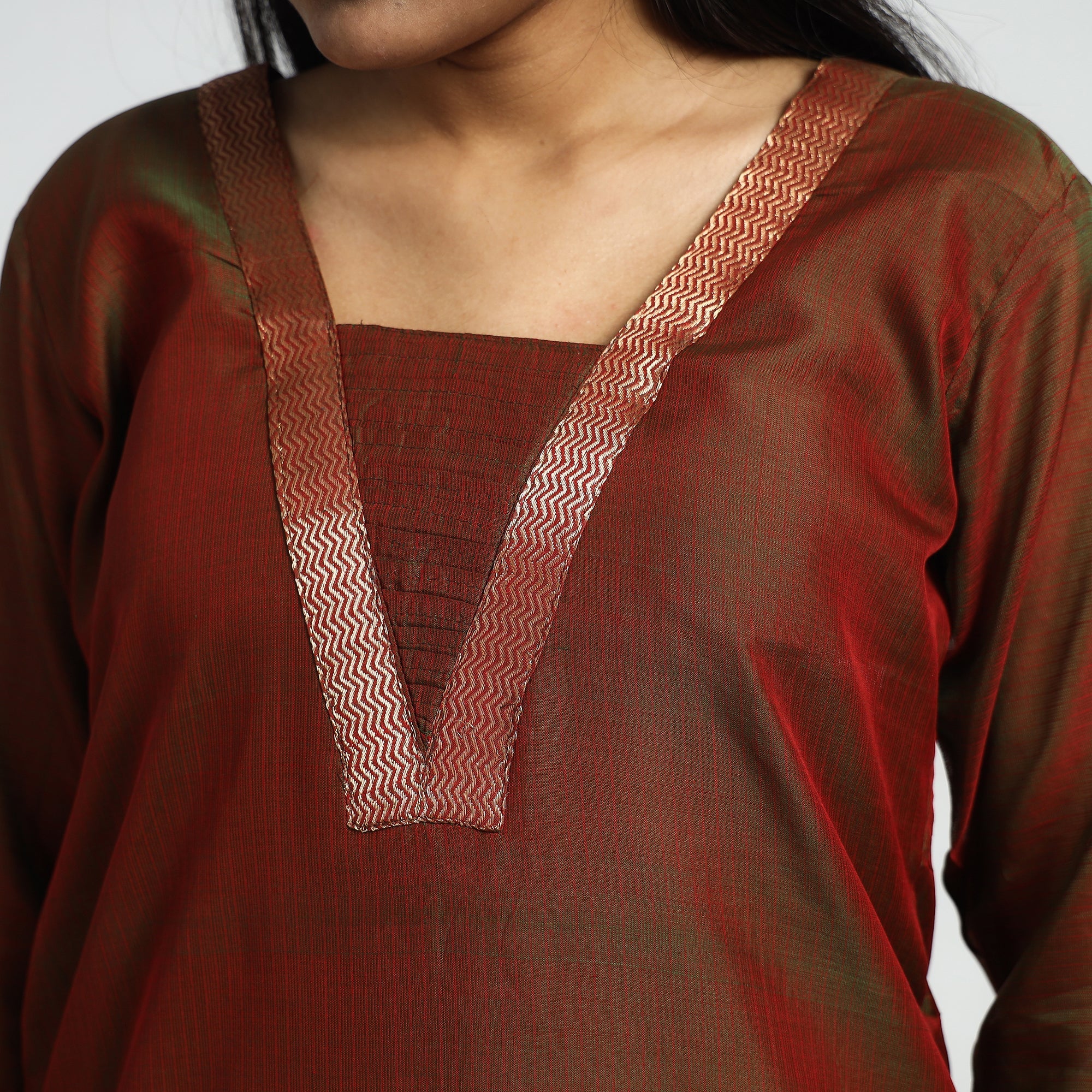 The rich heritage of handloom tradition with this finest maheshwari silk-cotton checks kurta and dupatta set. Crafted from a luxurious blend of cotton and maheshwari silk, the kurta showcases traditional handloom craftsmanship. The kurta also features a convenient one-side pocket, perfect for carrying small essentials. This set traditional charm with its elegant design, making it an ideal choice for celebrations.