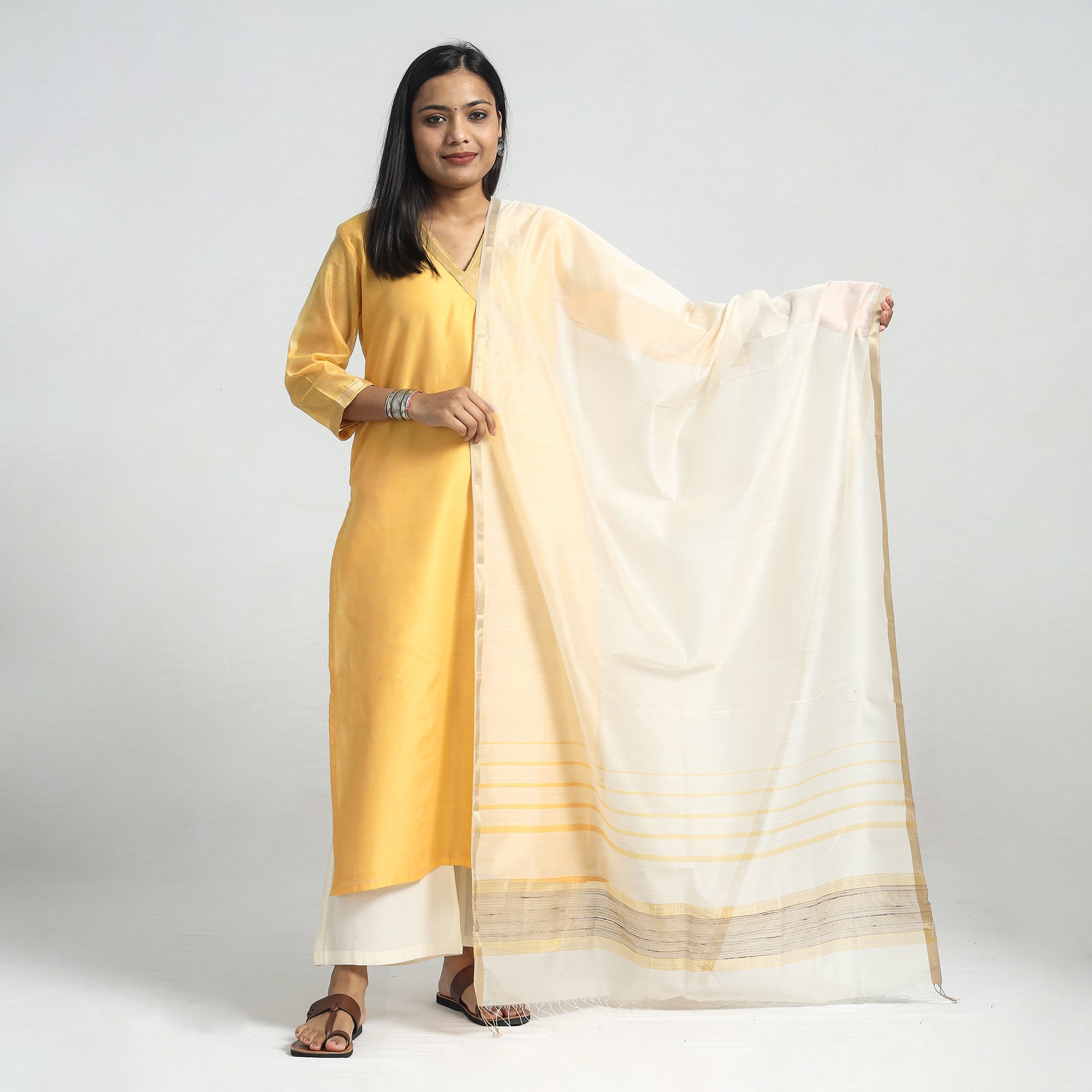 The rich heritage of handloom tradition with this finest maheshwari silk-cotton zari work kurta with dupatta set. Crafted from a blend of cotton and maheshwari silk, the kurta features intricate zari work and showcases traditional handloom craftsmanship. The kurta also features a convenient one-side pocket, perfect for carrying small essentials. This set traditional charm with its elegant design, making it an ideal choice for celebrations.