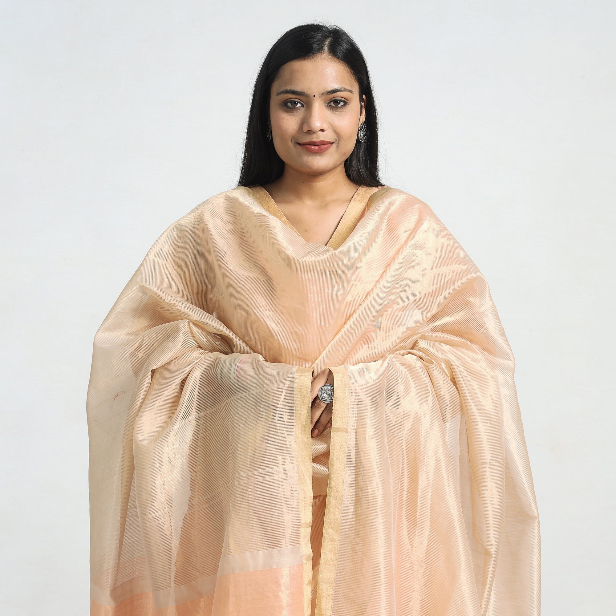 The rich heritage of handloom tradition with this finest maheshwari silk-cotton tissue zari work kurta with dupatta set. Crafted from a luxurious blend of cotton and maheshwari silk, the kurta features intricate tissue zari work and showcases traditional handloom craftsmanship. The kurta also features a convenient one-side pocket, perfect for carrying small essentials. This set traditional charm with its elegant design, making it an ideal choice for celebrations.