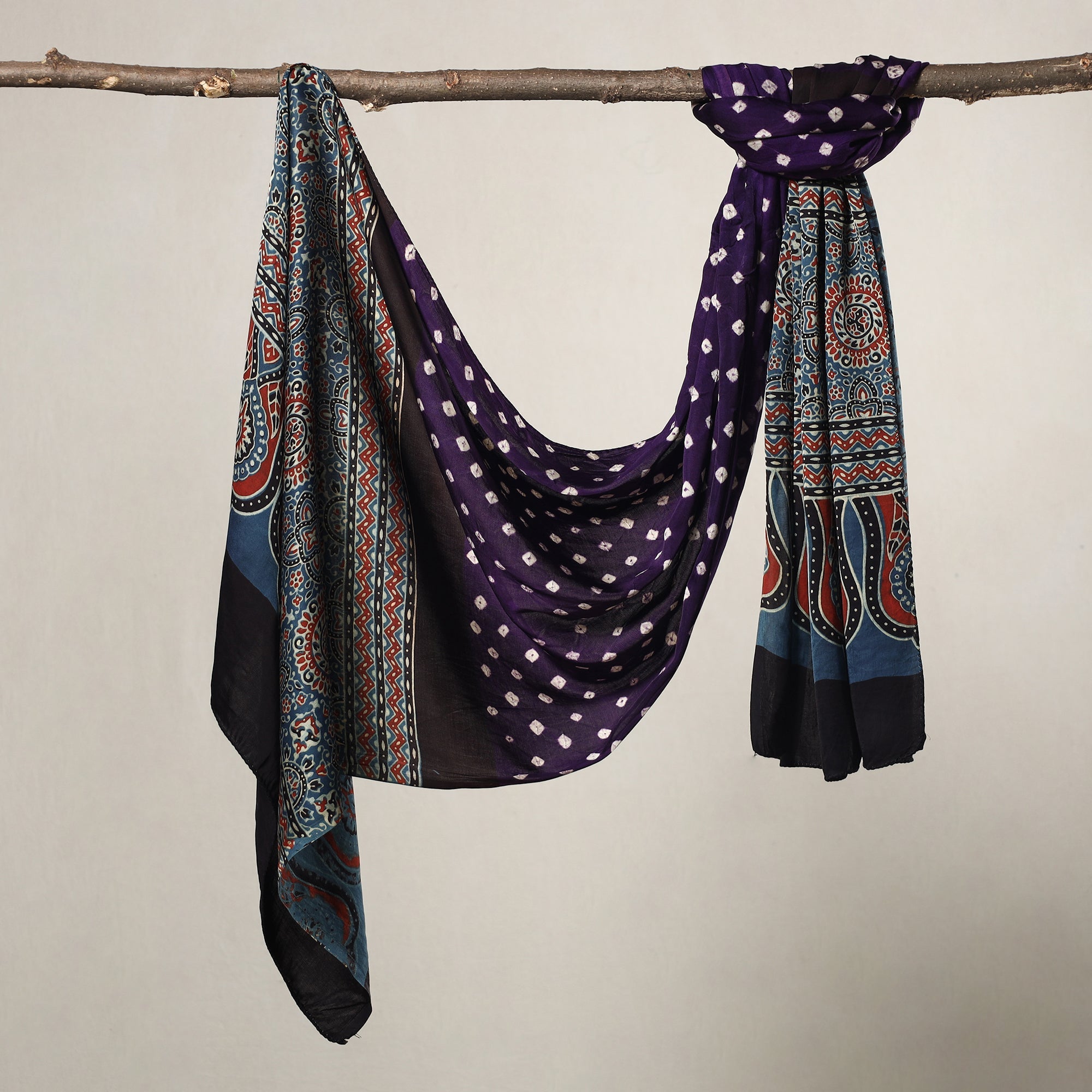 This orange bandhani tie-dye ajrakh block-printed stole is crafted from luxurious modal silk, a fabric known for its softness and lustrous sheen. This stole beautifully merges the artistic techniques of bandhani and ajrakh, presenting a seamless blend of tradition. Perfect for adding a touch of elegance to both casual and formal attire, it effortlessly combines comfort with sophistication.