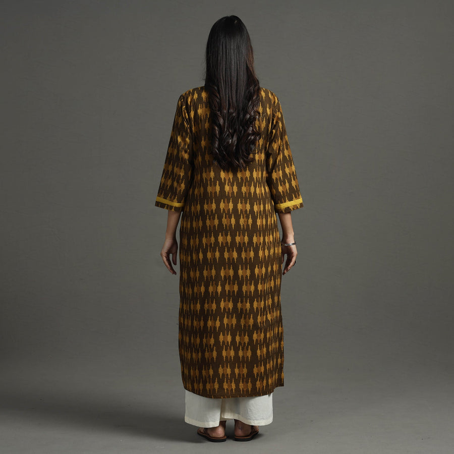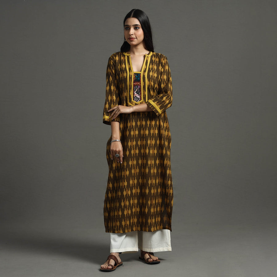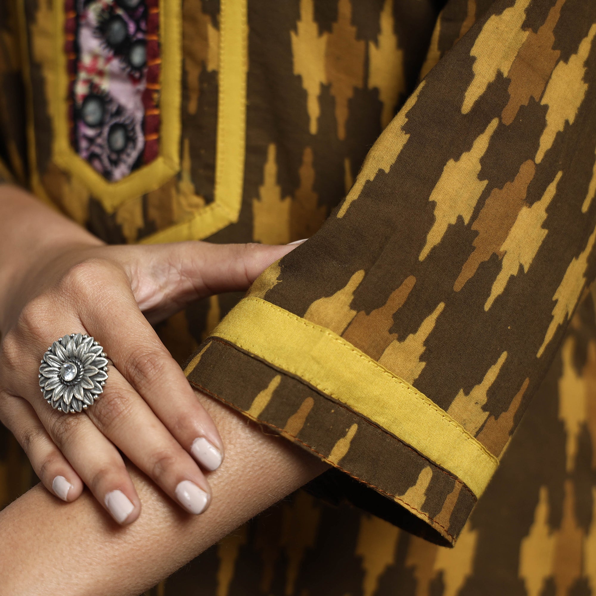 This uniquely designed akola hand block printed straight cut cotton long kurta is made using naturally dyed cotton fabric through the traditional mud resist process of hand block printing practised by the master artisans in Akola village, Rajasthan. It boasts traditional kutch embroidery patchwork designs, adding a touch of elegance to your ensemble. The kurta also features a convenient one-side pocket, perfect for carrying small essentials. This cotton kurta makes you comfortable all day long. This kurta is perfect for your daily outing and for a special occasion.