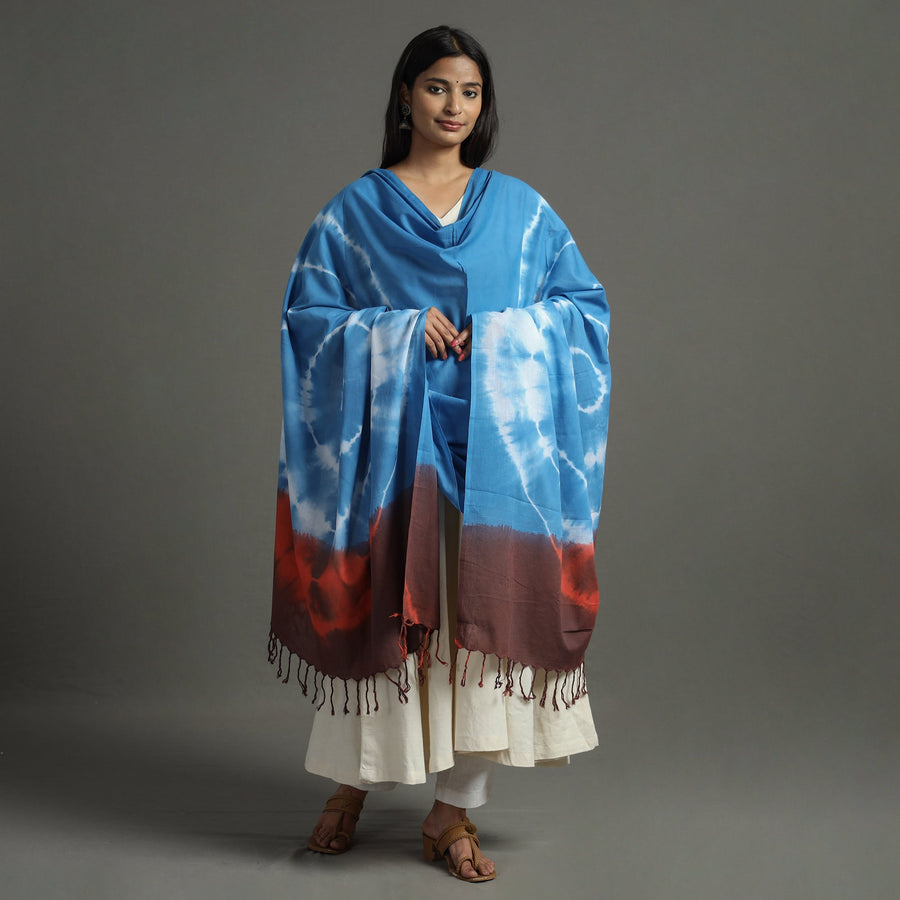 Adorn yourself in the artisanal elegance of our shibori tie-dye cotton dupatta with tassels. This dupatta is hand dyed using the shibori tie and dye technique, in which the fabric is tied using a clamp or stitches in the required design and the pattern is dyed. Embrace comfort and individuality with this chic and timeless dupatta that seamlessly transitions from ethnic occasions to everyday wear.