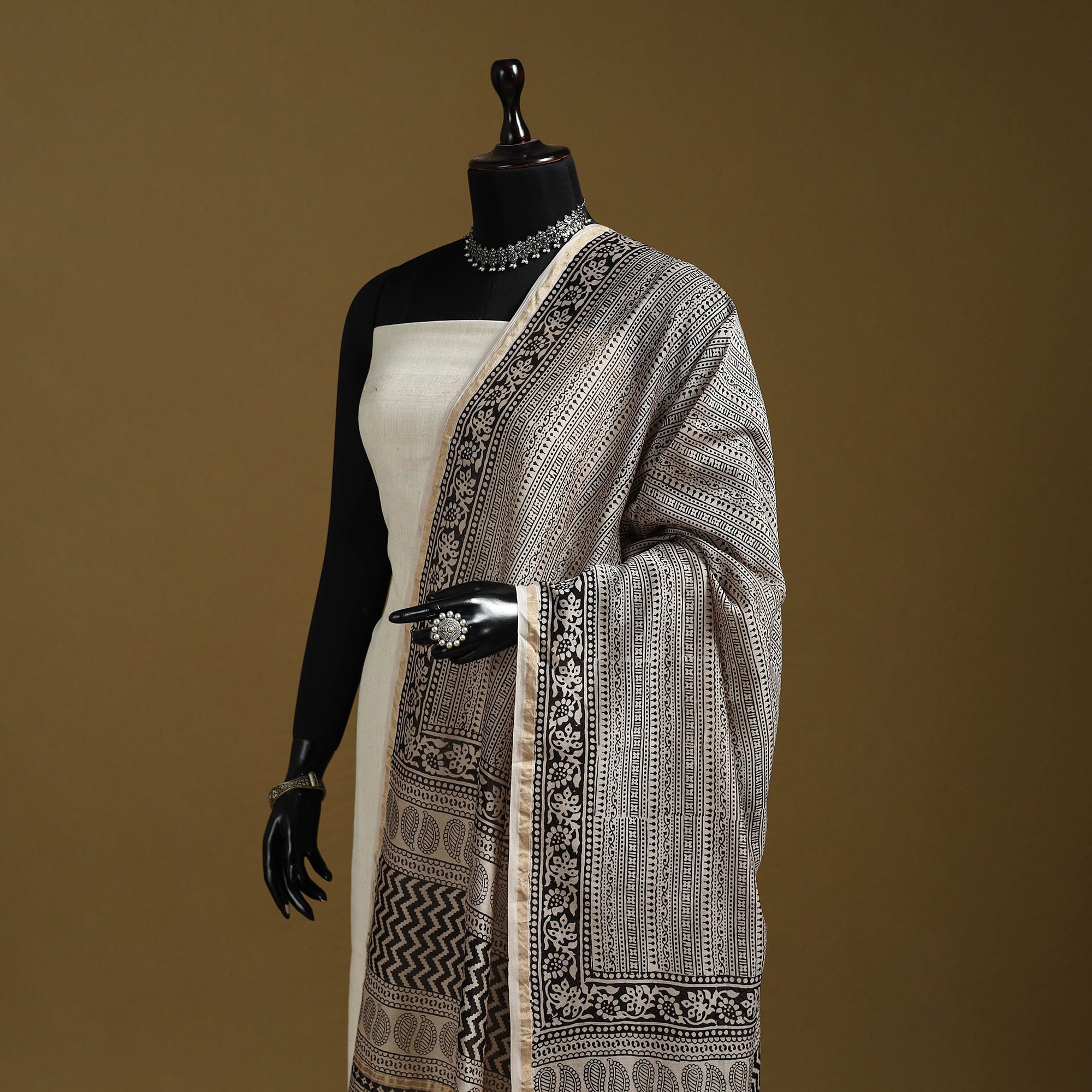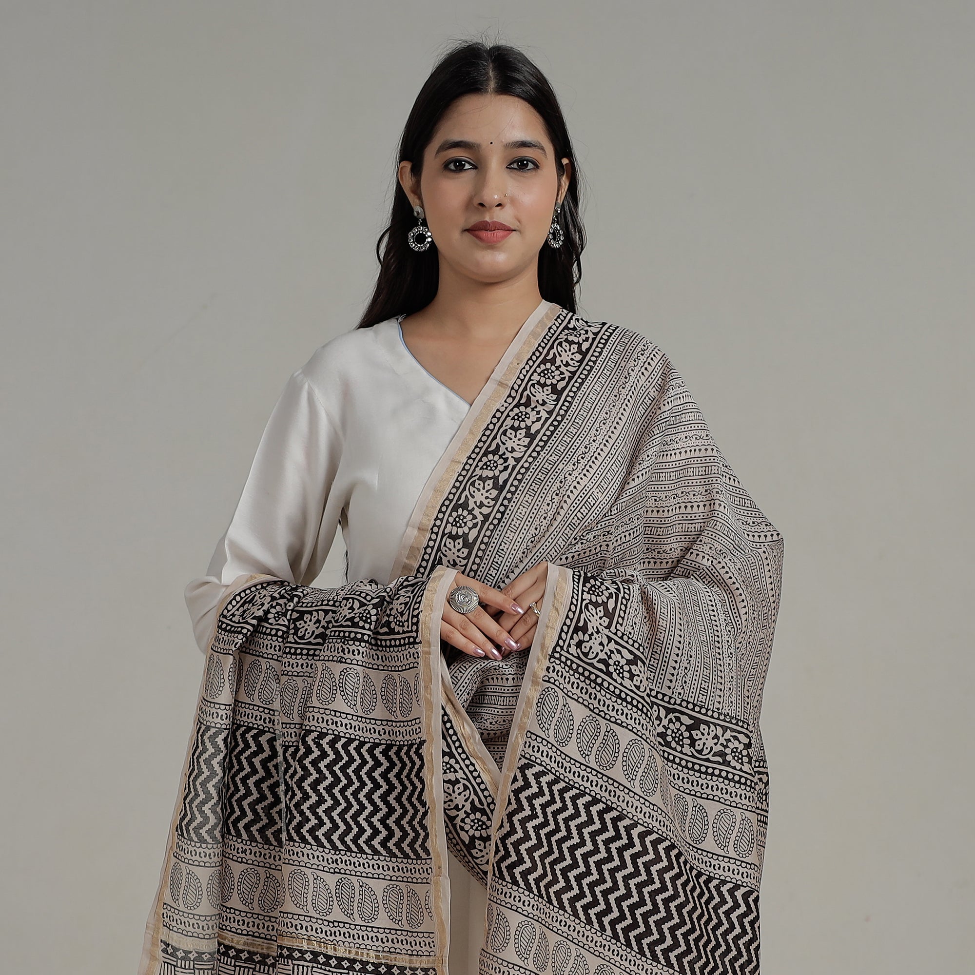 This exquisite grey bagh hand block printed natural dyed chanderi silk cotton dupatta with zari border a fine creation by artisan Mohammed Rafik Ji Khatri from Bagh, the Dhar district of Madhya Pradesh. Crafted with utmost care and precision, this elegant accessory showcases traditional artistry. The intricate block prints and natural dyes add charm to the dupatta, making it a must-have addition to your wardrobe.