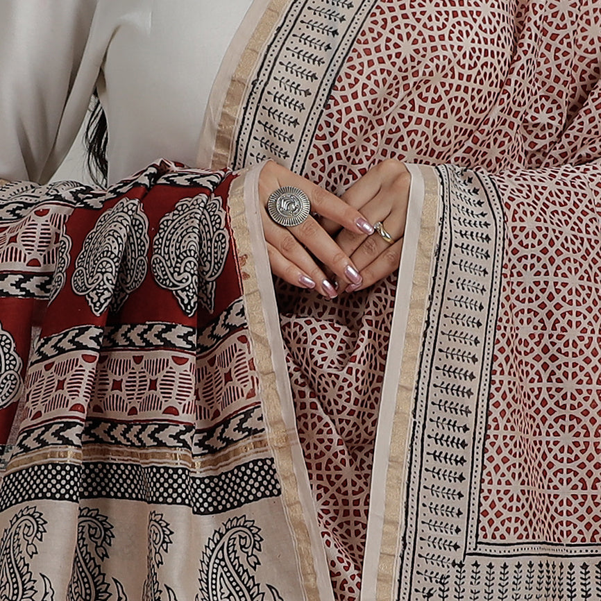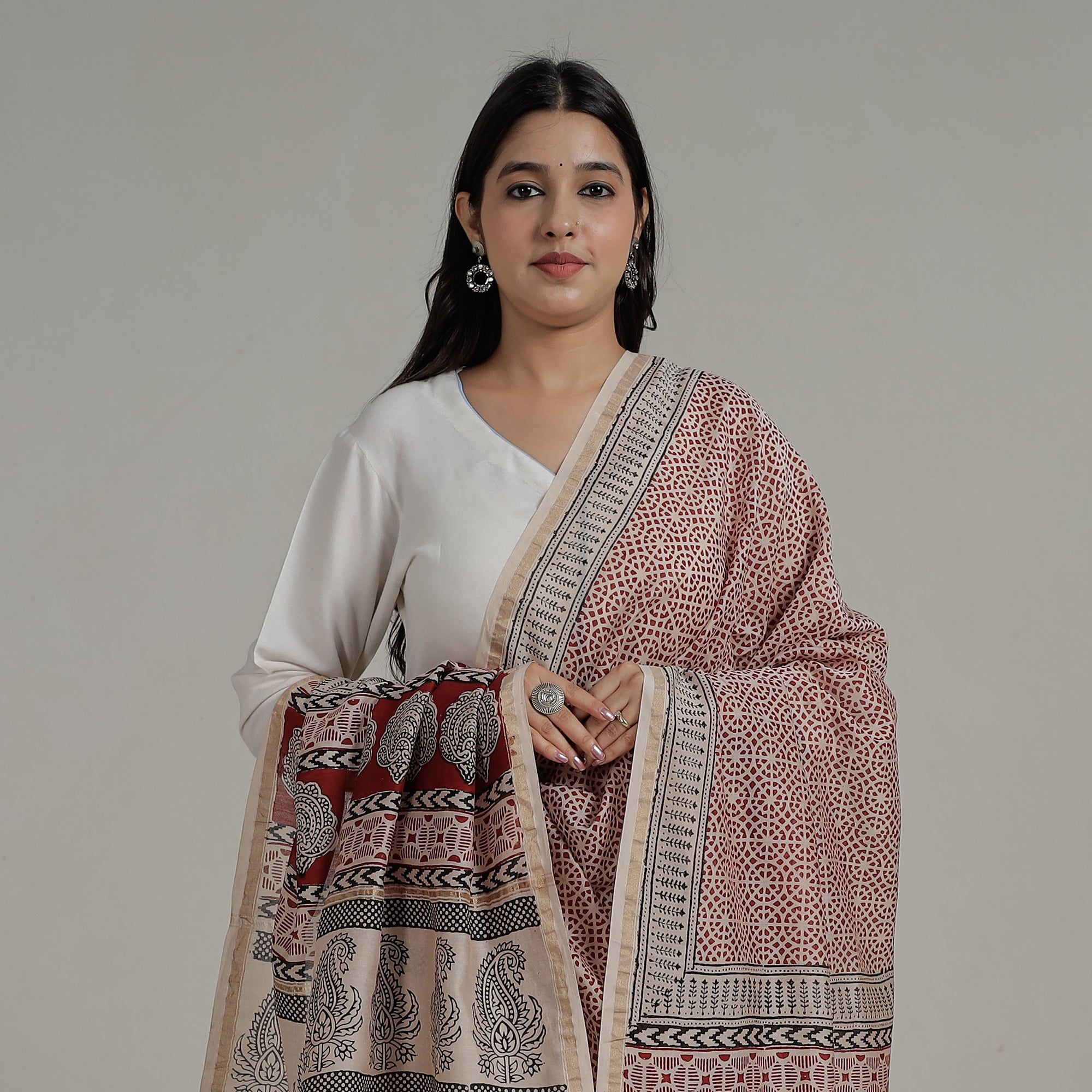 This exquisite red bagh hand block printed natural dyed chanderi silk cotton dupatta with zari border a fine creation by artisan Mohammed Rafik Ji Khatri from Bagh, the Dhar district of Madhya Pradesh. Crafted with utmost care and precision, this elegant accessory showcases traditional artistry. The intricate block prints and natural dyes add charm to the dupatta, making it a must-have addition to your wardrobe.