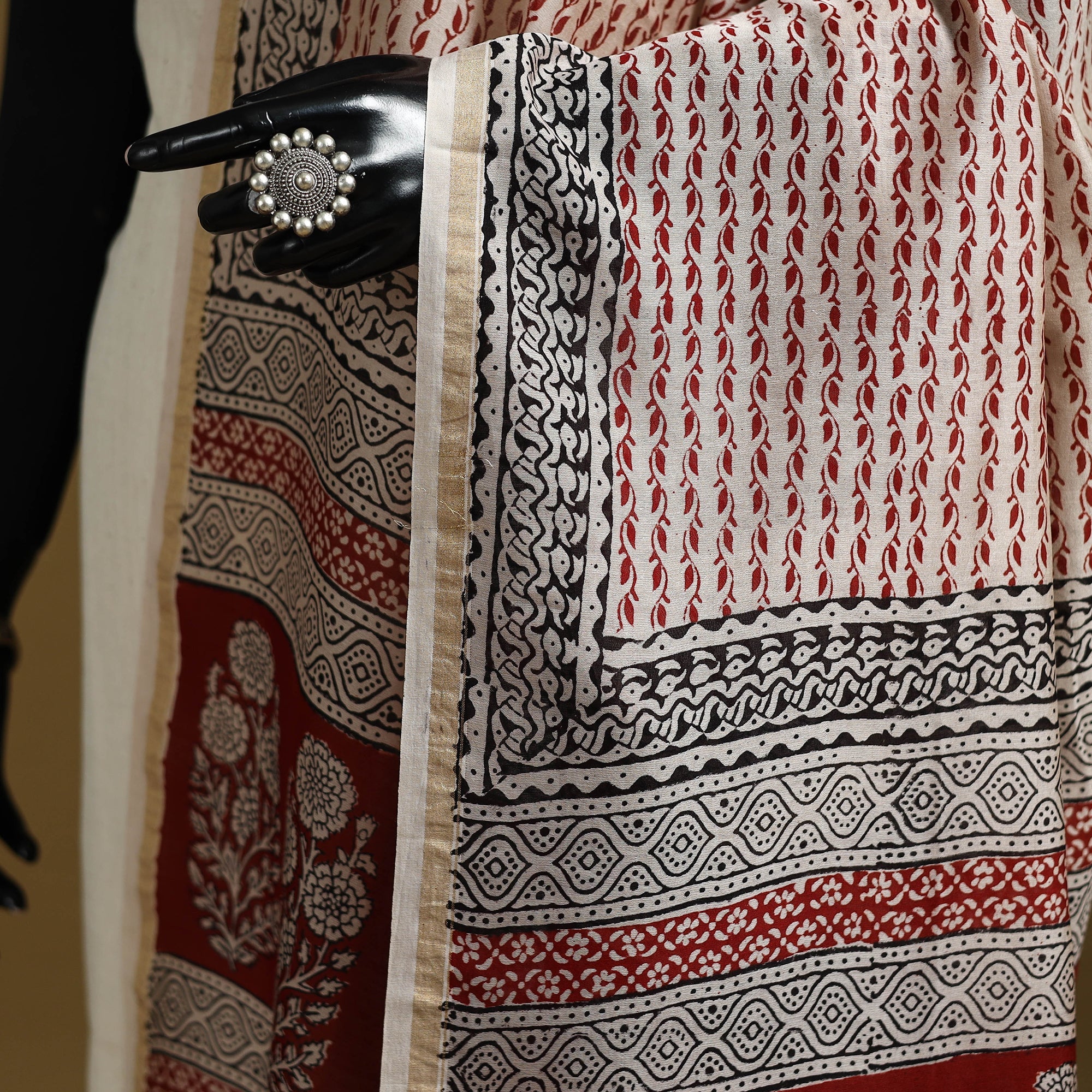 This exquisite red bagh hand block printed natural dyed chanderi silk cotton dupatta with zari border a fine creation by artisan Mohammed Rafik Ji Khatri from Bagh, the Dhar district of Madhya Pradesh. Crafted with utmost care and precision, this elegant accessory showcases traditional artistry. The intricate block prints and natural dyes add charm to the dupatta, making it a must-have addition to your wardrobe.