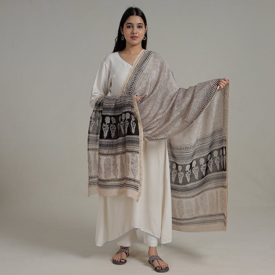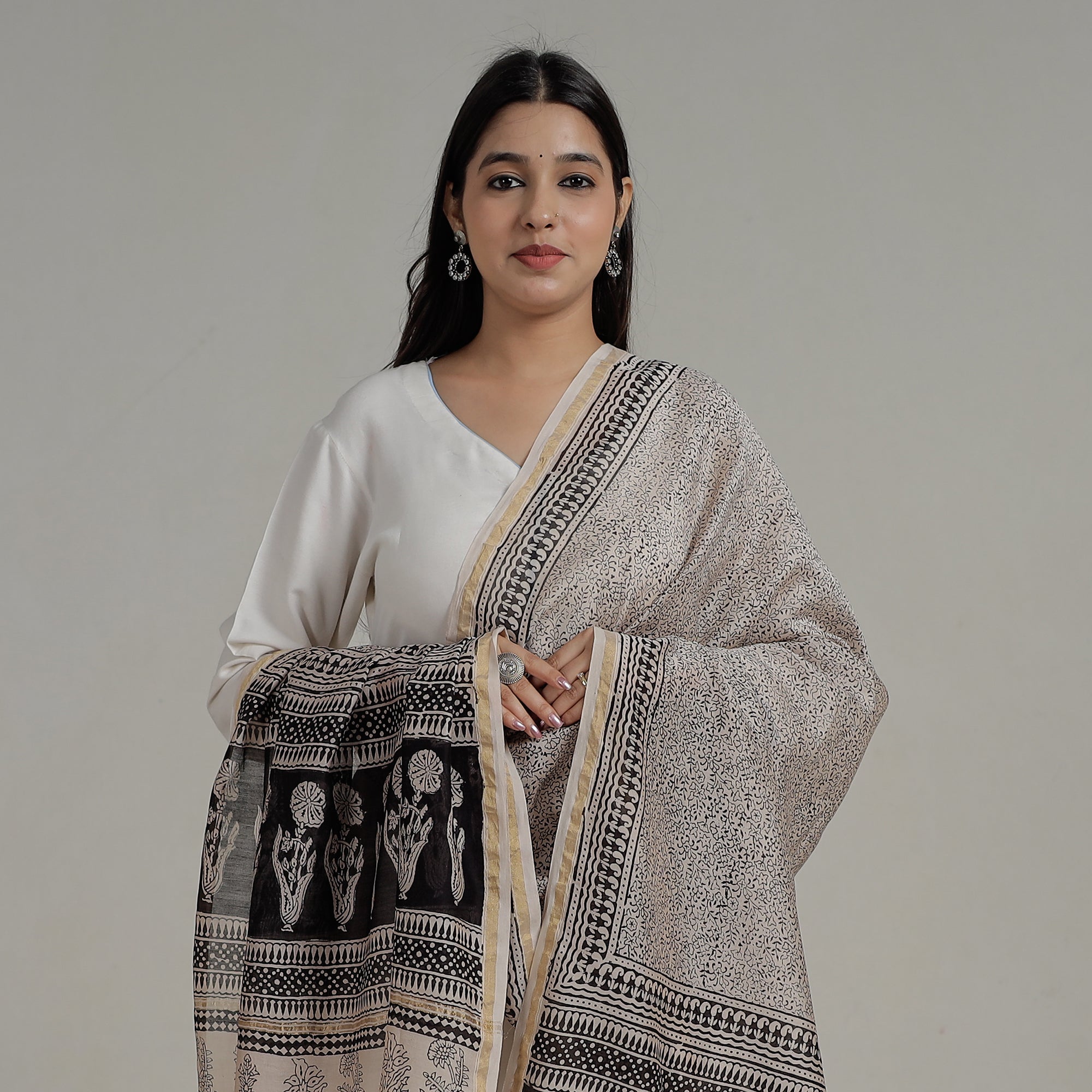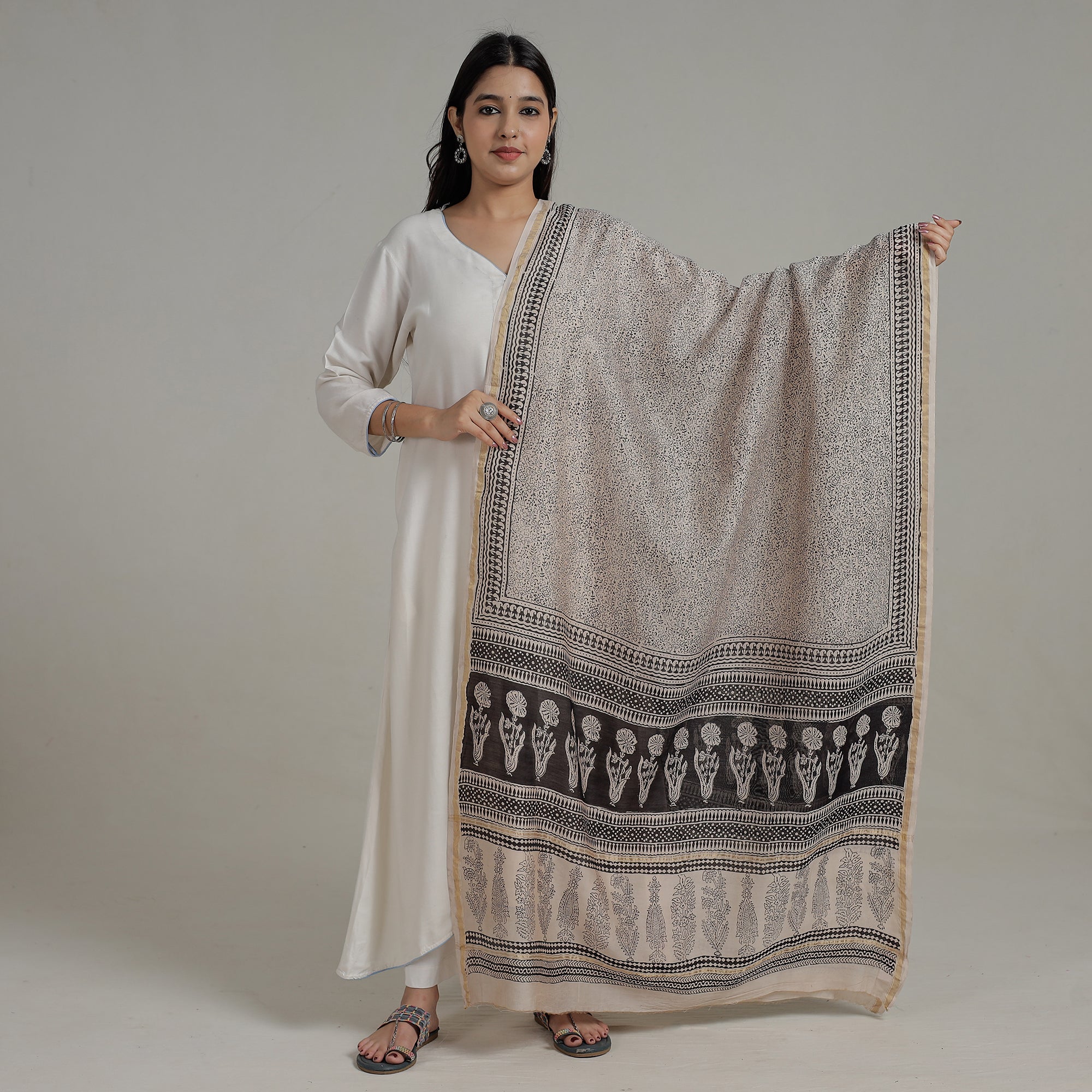 This exquisite beige bagh hand block printed natural dyed chanderi silk cotton dupatta with zari border a fine creation by artisan Mohammed Rafik Ji Khatri from Bagh, the Dhar district of Madhya Pradesh. Crafted with utmost care and precision, this elegant accessory showcases traditional artistry. The intricate block prints and natural dyes add charm to the dupatta, making it a must-have addition to your wardrobe.