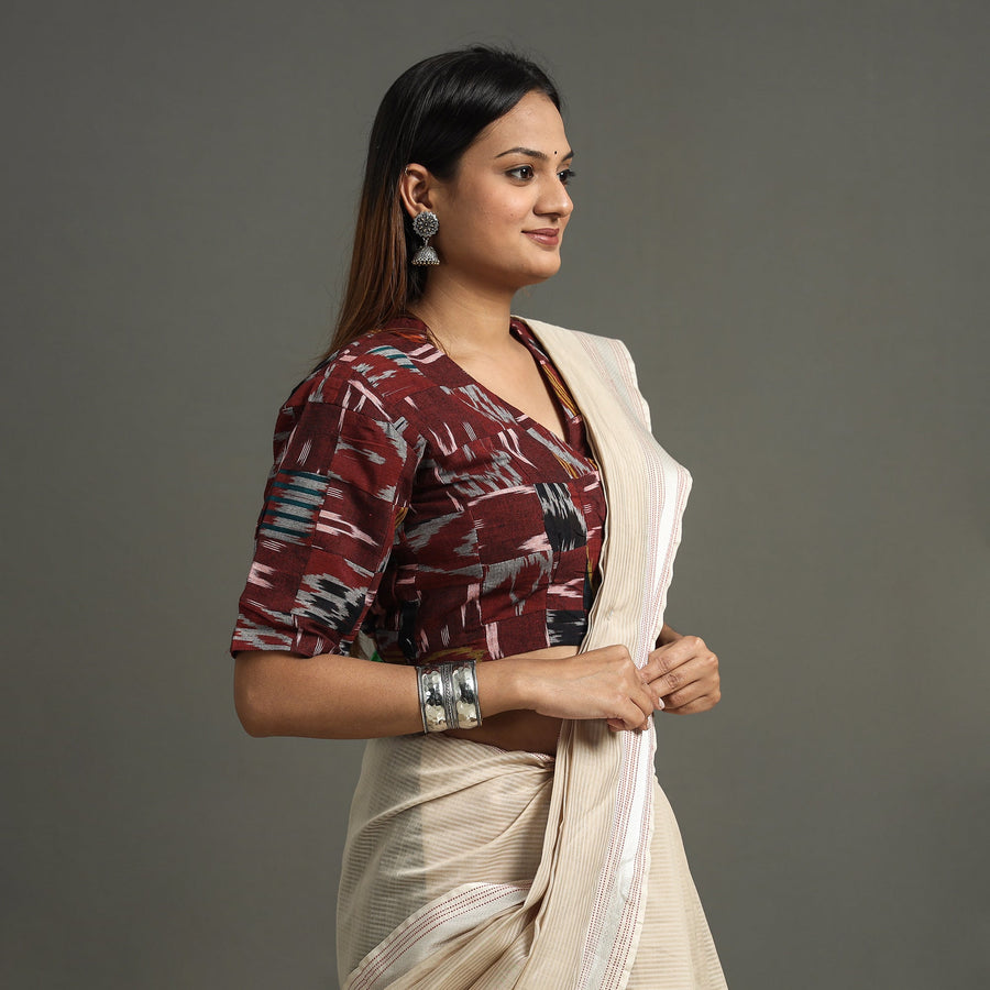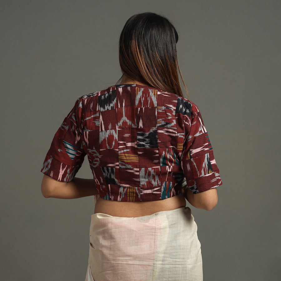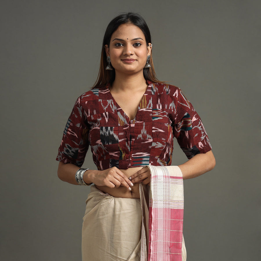This pochampally ikat patchwork cotton blouse is seamlessly stitched with padded comfort for a cozy and relaxed fit. Crafted from cotton fabric, known for its breathability and comfort. It features half sleeves that provide balanced coverage, making it perfect for any occasion. The hook lock adds convenience and allows for easy wear and removal. Its standout features include patchwork design and premium craftsmanship, making it a must-have addition to your wardrobe.