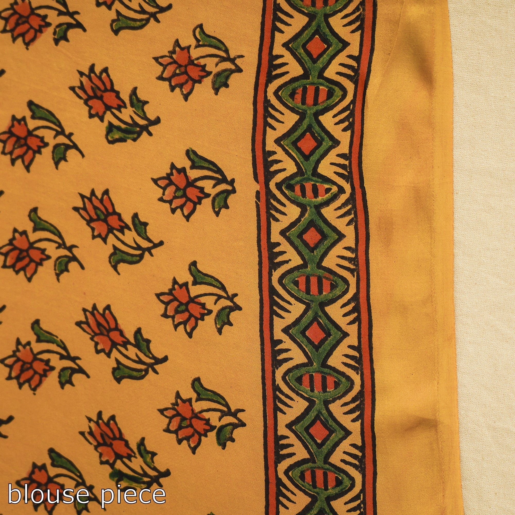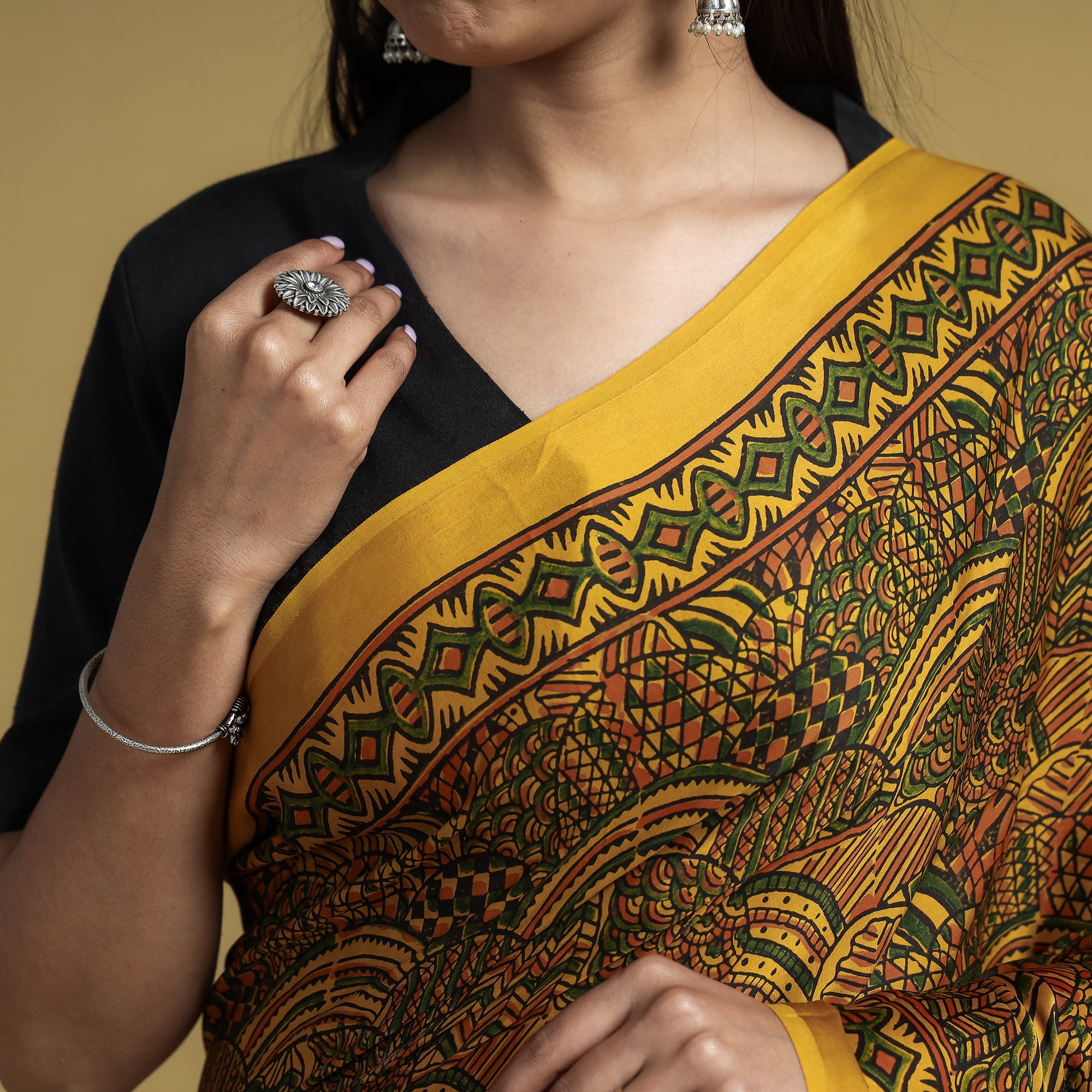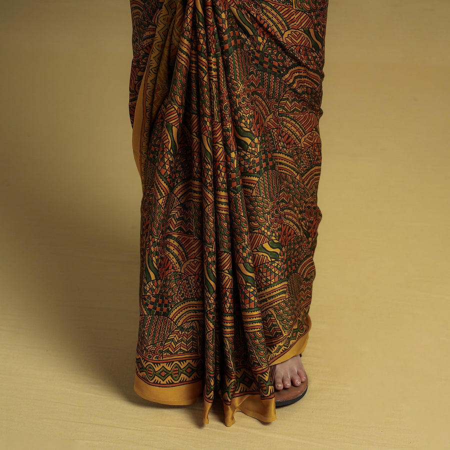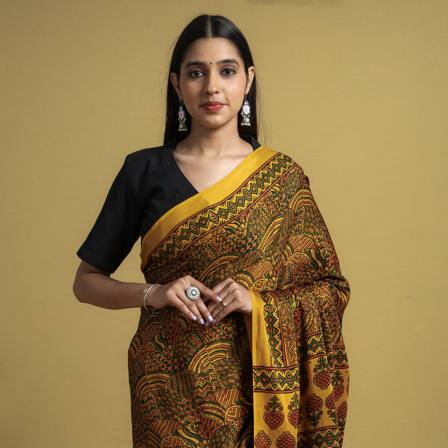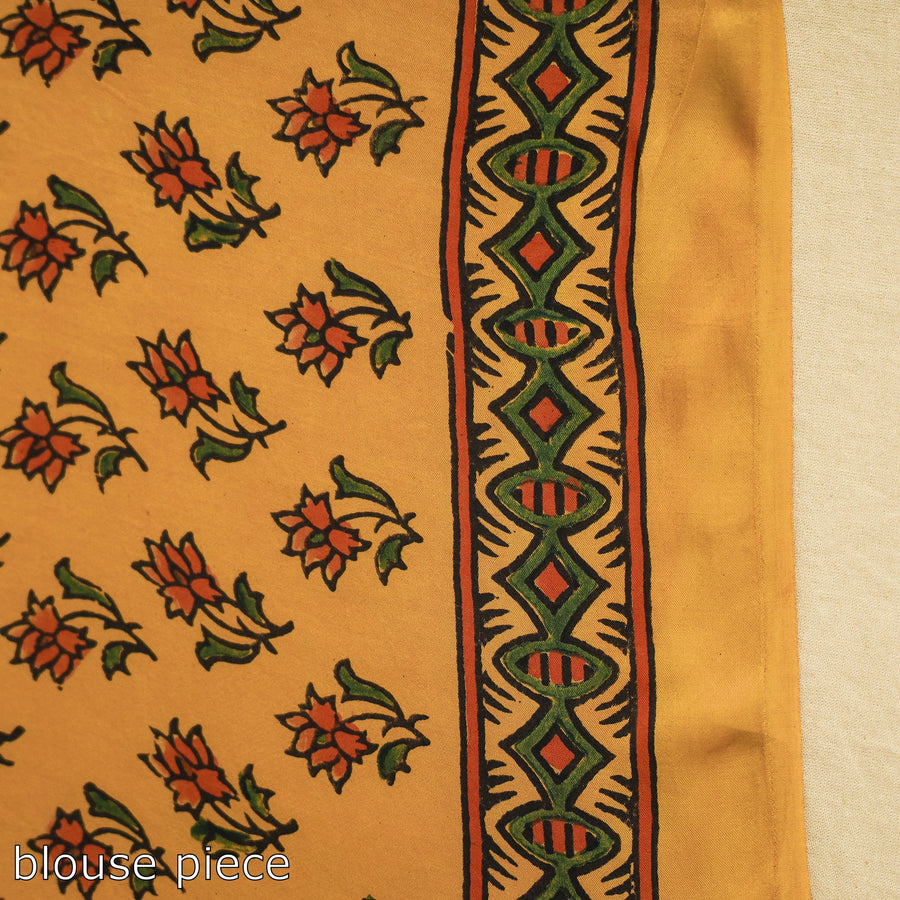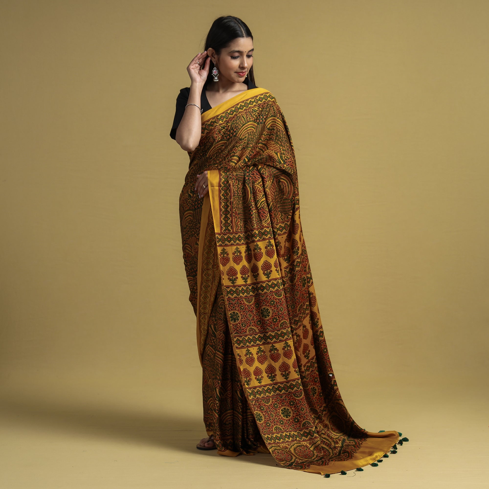 This yellow natural dyed hand block print modal silk ajrakh saree with tassels is made using natural dyes through the traditional ajrakh technique of hand-block printing practiced by the artisans in the kutch region of Gujarat. Ajrakh is a traditional vegetable dyeing and resist block-printing technique on cloth. It is estimated to be around 4,500 years old. The Ajrakh artisans in India are originally from Sindh, and they migrated to Kutch in Gujarat and Barmer in Rajasthan. Ajrakh is the traditional attire of the Maldhari pastoral community of Bhuj. The process of 'Ajrakh' is a long-drawn process with many stages, and each layer of colour is printed after a gap of time, so the cloth has to stay for the day.