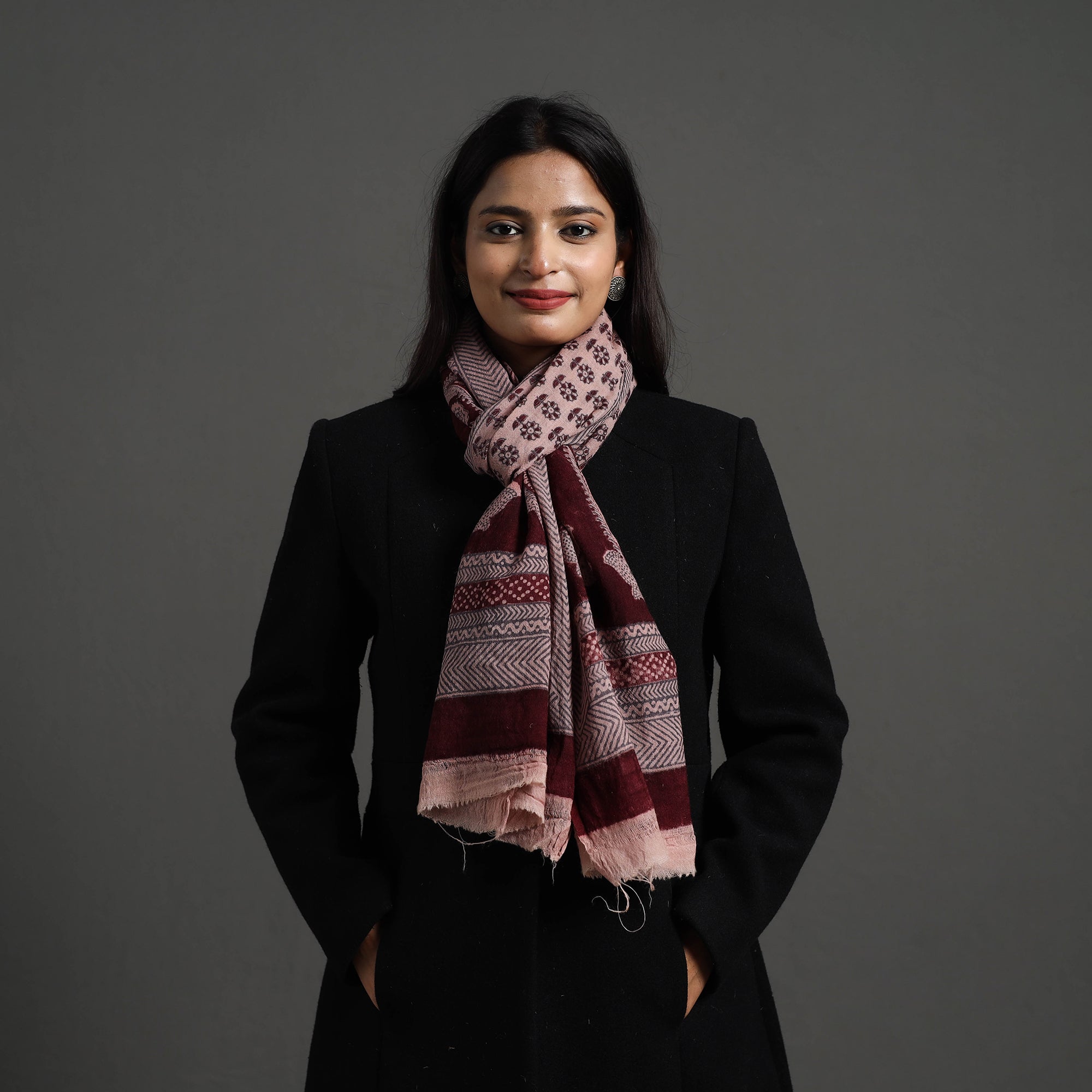 Fine quality maroon bagh hand block printed woollen stole. This exquisite stole is made using natural dyes through the traditional process of hand block printing by Umar faruk khatri in Bagh, the Dhar district of Madhya Pradesh. The pure wool construction offers exceptional warmth and softness, making it perfect for cold weather. Its versatile, suitable for both formal and casual occasions, adding a touch of traditional Indian artistry to your style.