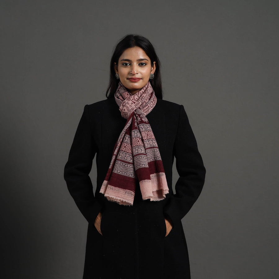 Fine quality maroon bagh hand block printed woollen stole. This exquisite stole is made using natural dyes through the traditional process of hand block printing by Umar faruk khatri in Bagh, the Dhar district of Madhya Pradesh. The pure wool construction offers exceptional warmth and softness, making it perfect for cold weather. Its versatile, suitable for both formal and casual occasions, adding a touch of traditional Indian artistry to your style.