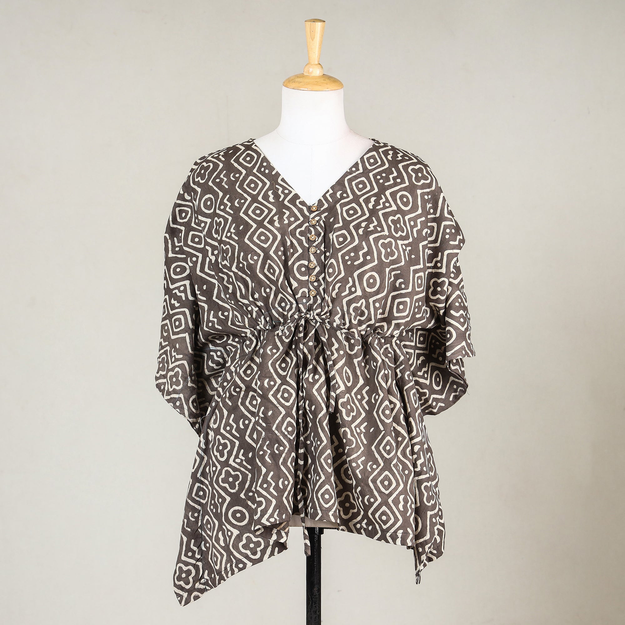 Fine quality akola block printed cotton kaftan with tie-up waist. A traditional kaftan or caftan is an short-length garment with long, flowing sleeves. It has an adjustable drawstring waist. These loose-fitting cotton kaftans are enhanced by a soft touch and beautiful hand block prints. This dress will allow you to move with ease and comfort. The drawstring waist tie will give you the freedom to customize the fit to suit your unique shape.