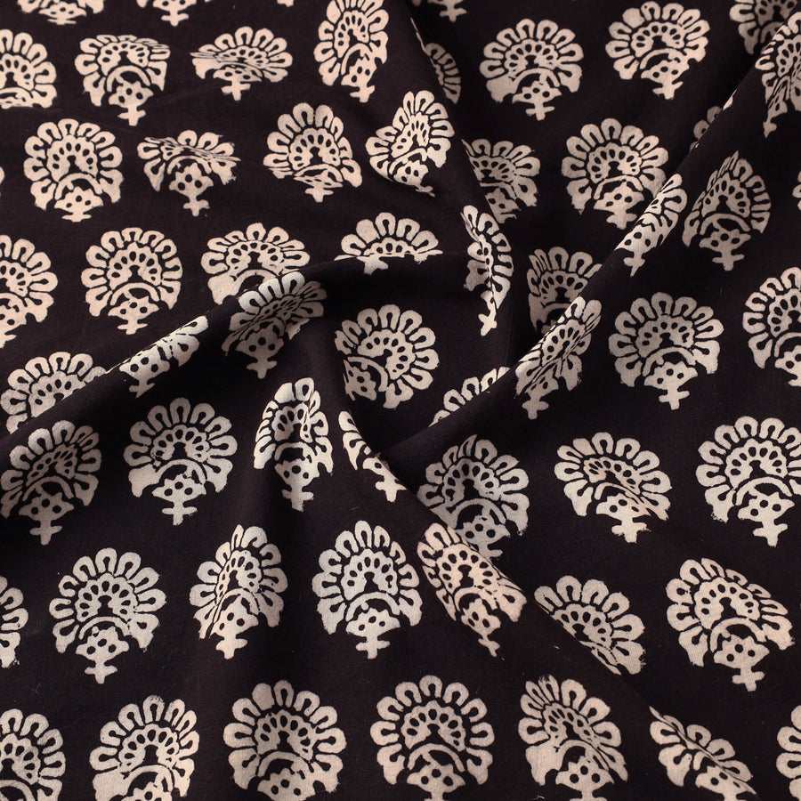 Fine quality black bagh hand block printed natural dyed cotton fabric. Meticulously crafted by the master artisan Mohammed Rafik Ji Khatri, who practices the age-old art of Bagh block printing in the Dhar district of Madhya Pradesh, this fabric is a testament to skilled artistry. Using natural dyes and following traditional processes, each motif and pattern on the fabric is carefully hand block printed, creating a unique and exquisite design.