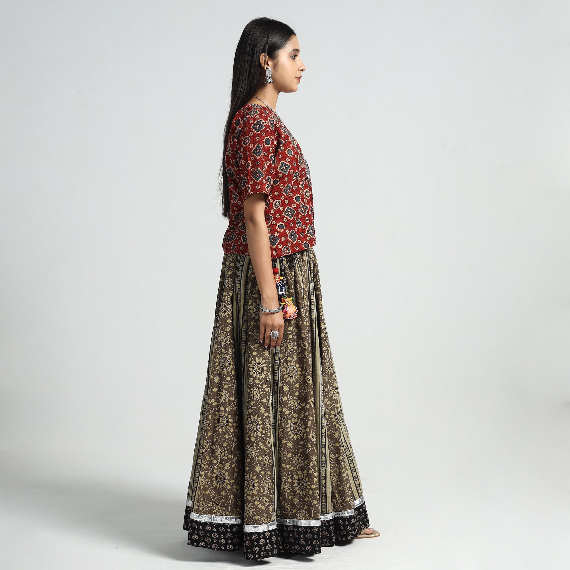 Elevate your wardrobe with our brown patchwork long skirt, skillfully crafted from ajrakh block-printed, natural-dyed cotton fabric. This skirt boasts a waist tie-up closure, allowing for a customized and comfortable fit. The patchwork kali design adds a unique touch, showcasing the skilled craftsmanship behind its creation. The natural dyes used in the printing process enhance the overall beauty of the garment. The intricate patterns and vibrant colors reflect the cultural heritage of Gujarat. Perfect for both casual and semi-formal occasions.